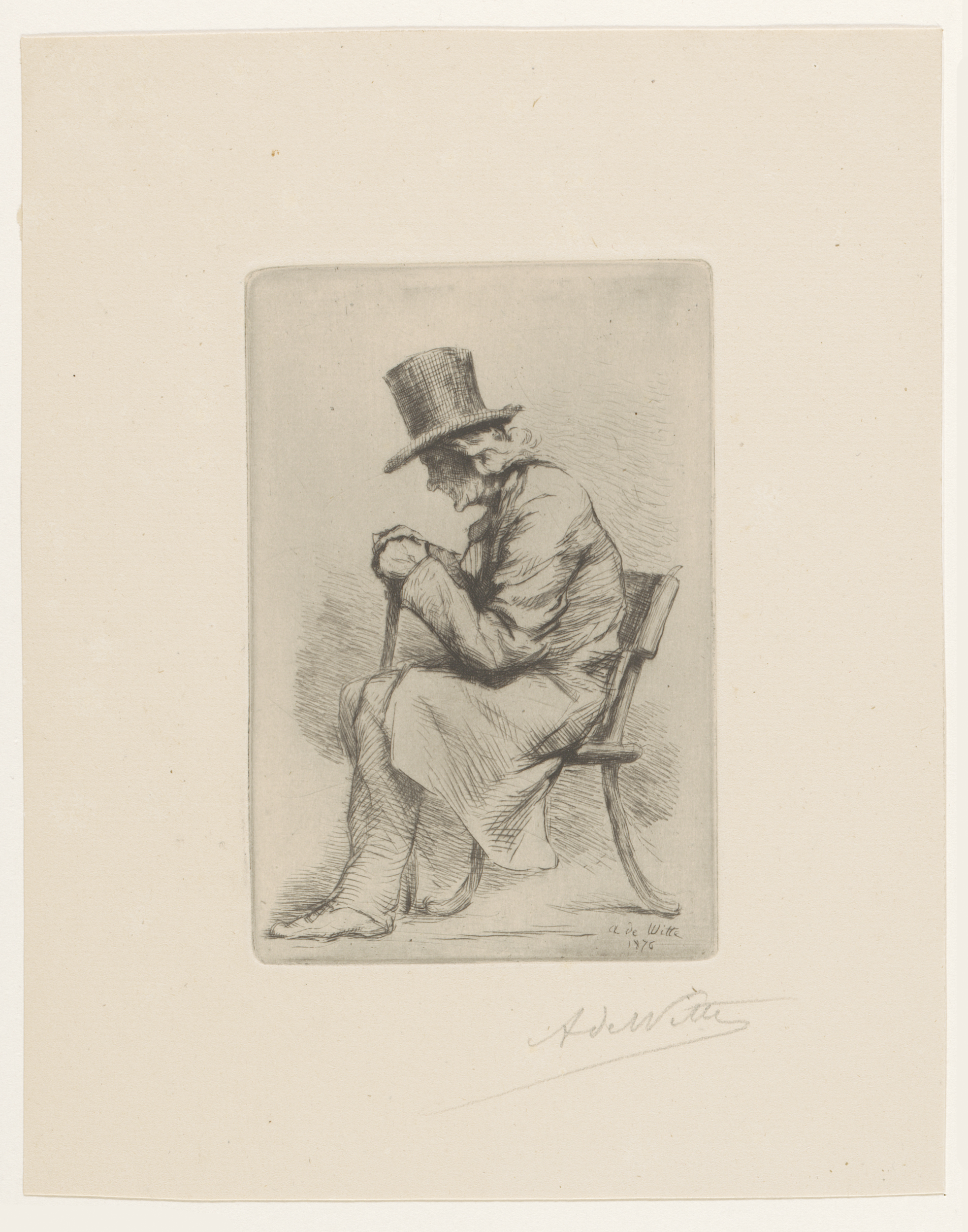 Oude man met hoed en wandelstok gezeten op een stoel