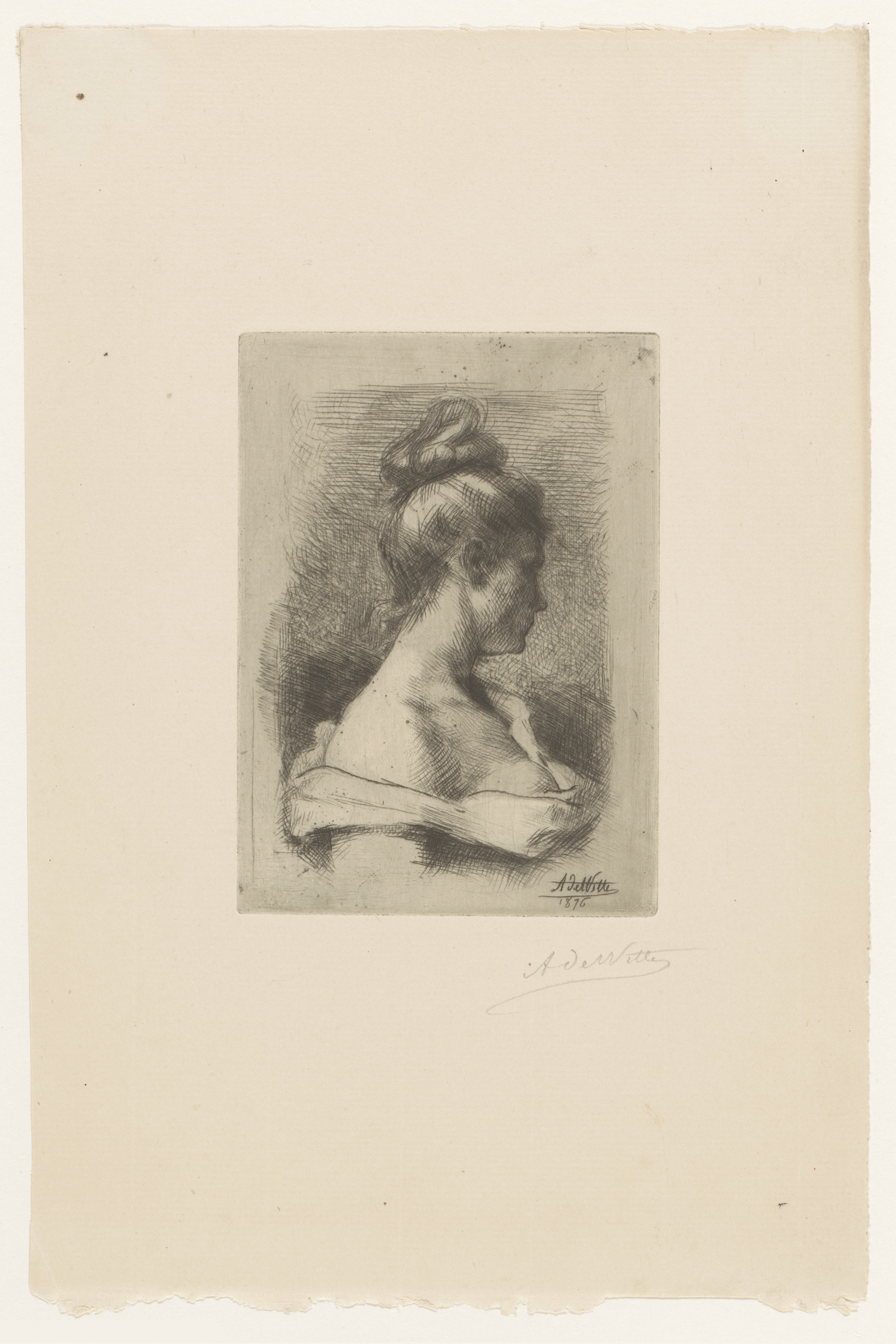 Borstbeeld van een jonge vrouw met hoog kapsel