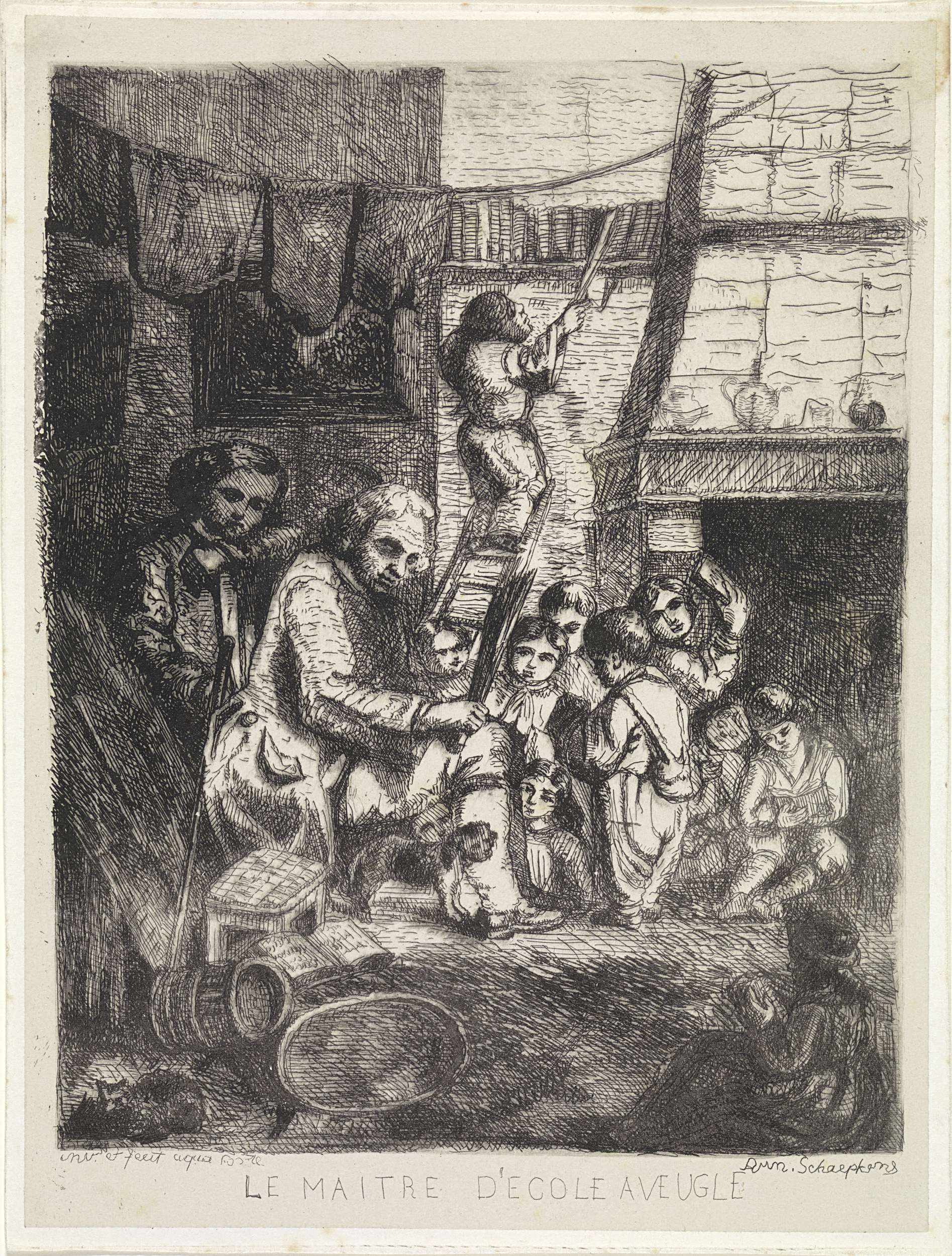 Schoolmeester omringd door kinderen