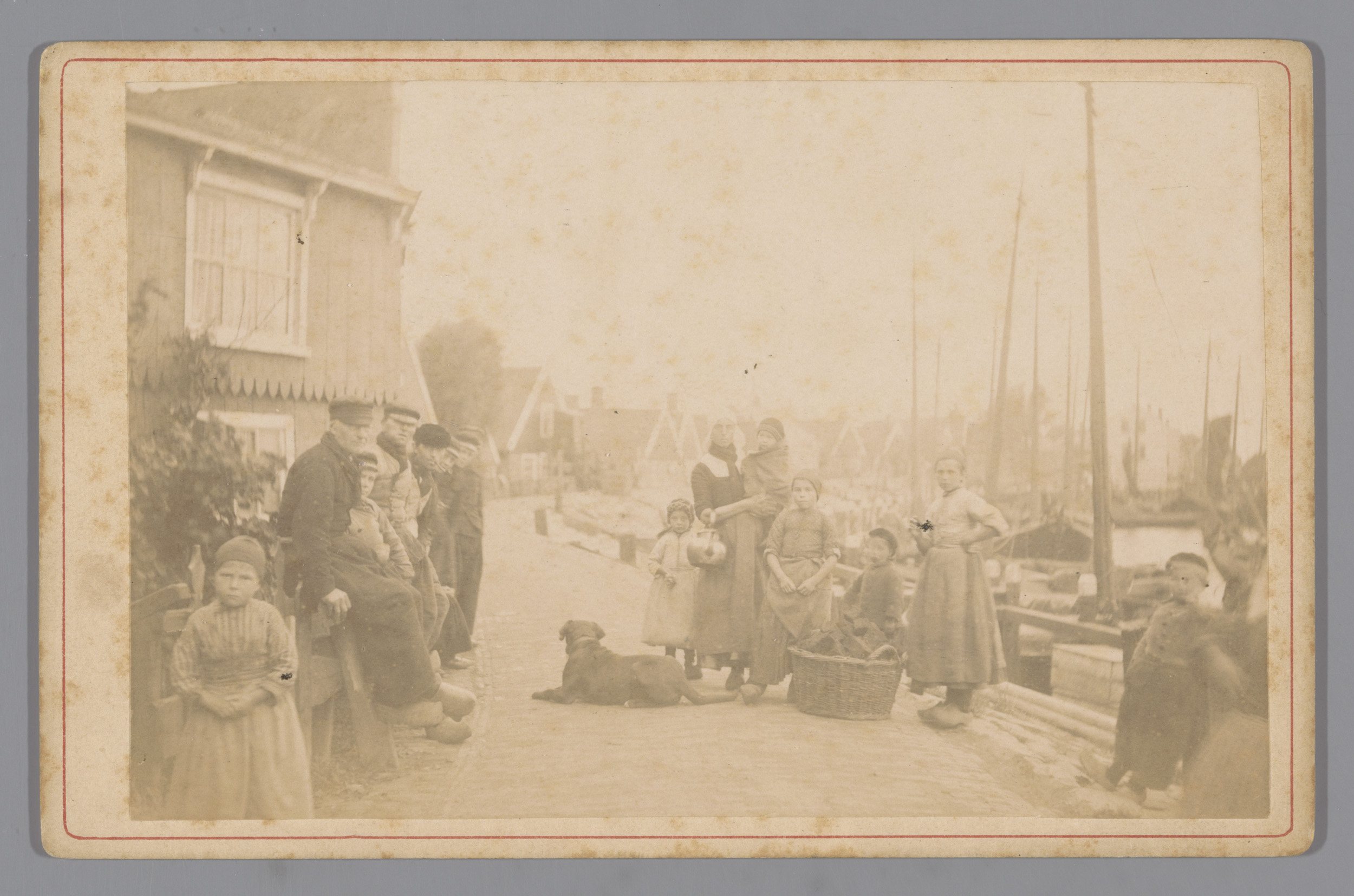 Groepsportret in klederdracht bij de haven van Volendam
