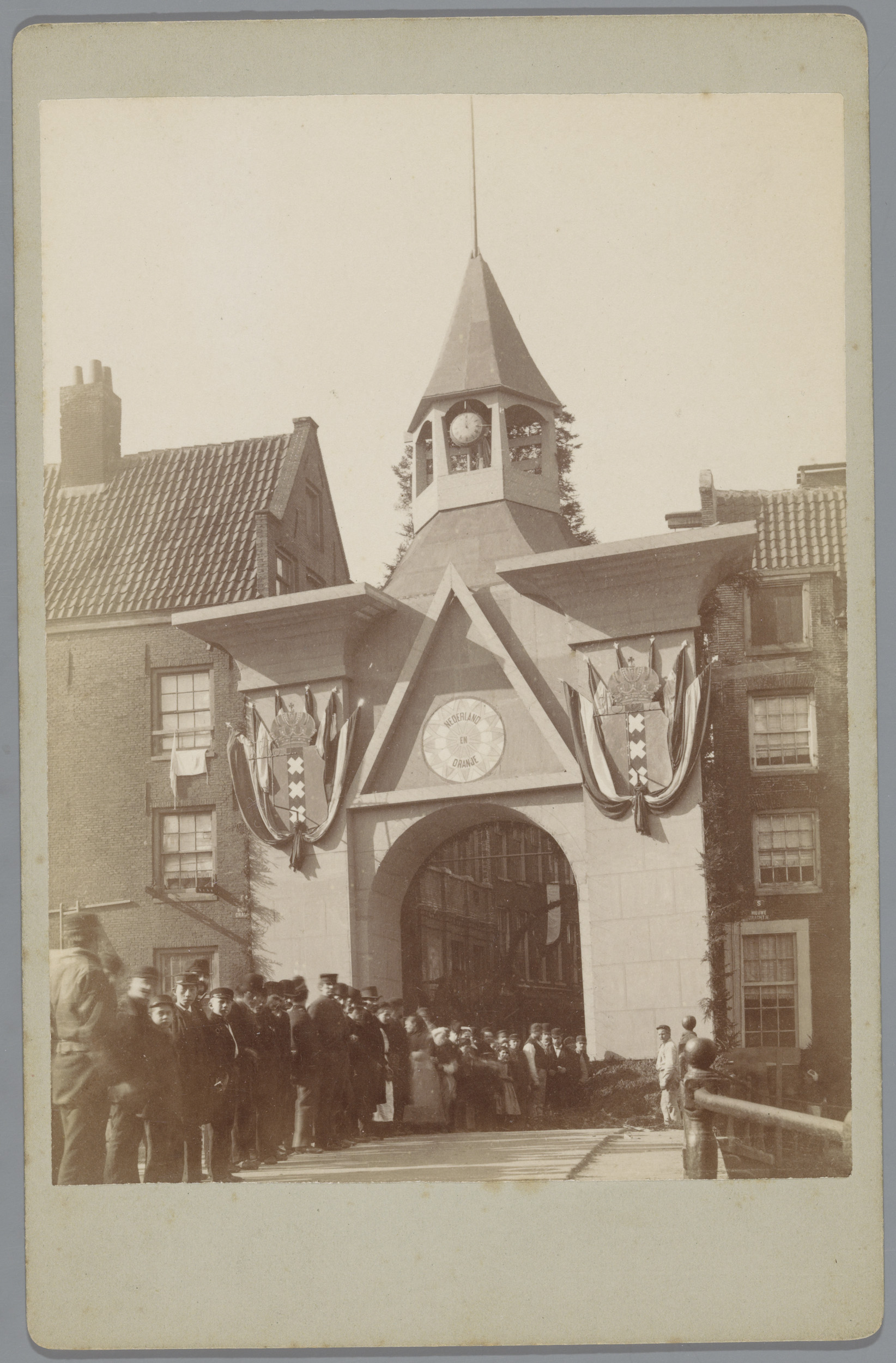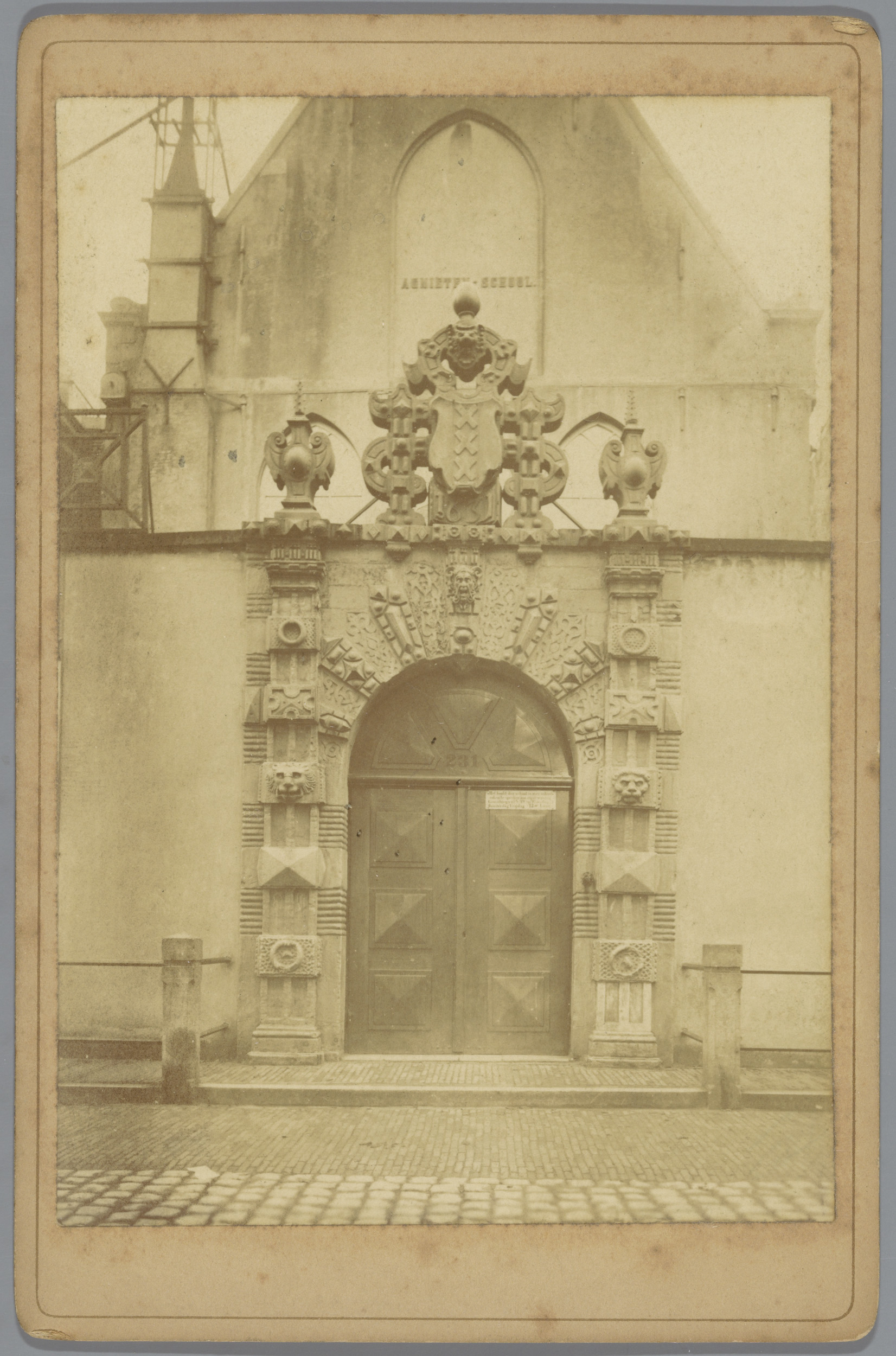 Gezicht op de poort van de Agnietenschool in Amsterdam