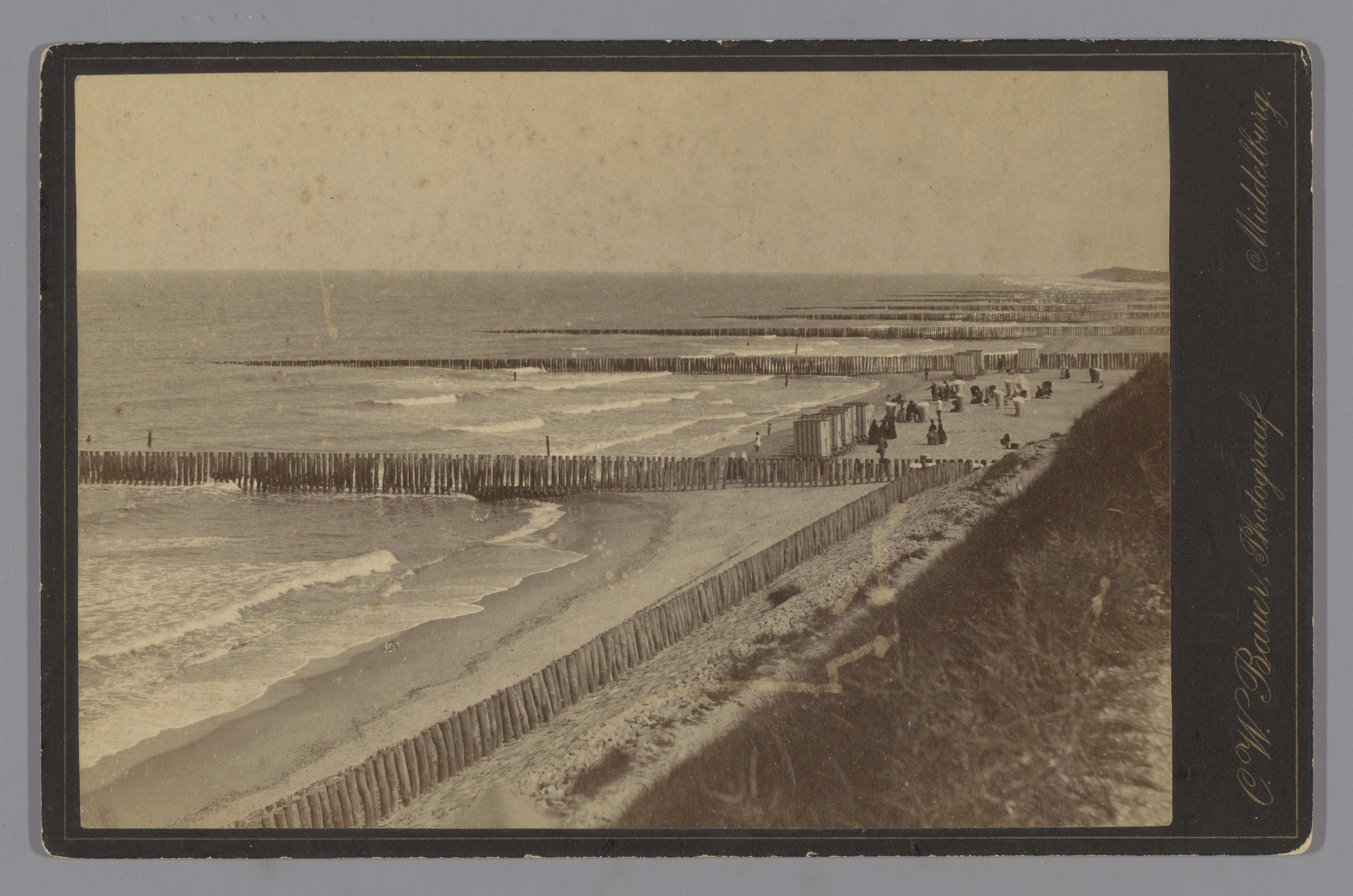 Gezicht op strand van Zeeland met zeeweringen en kle...