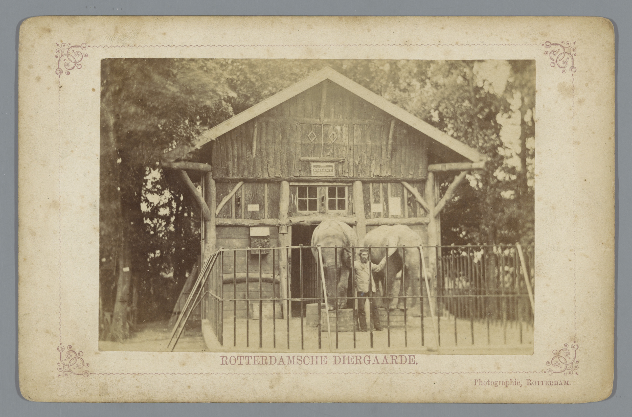 Twee olifanten met hun verzorger in de Rotterdamsche...