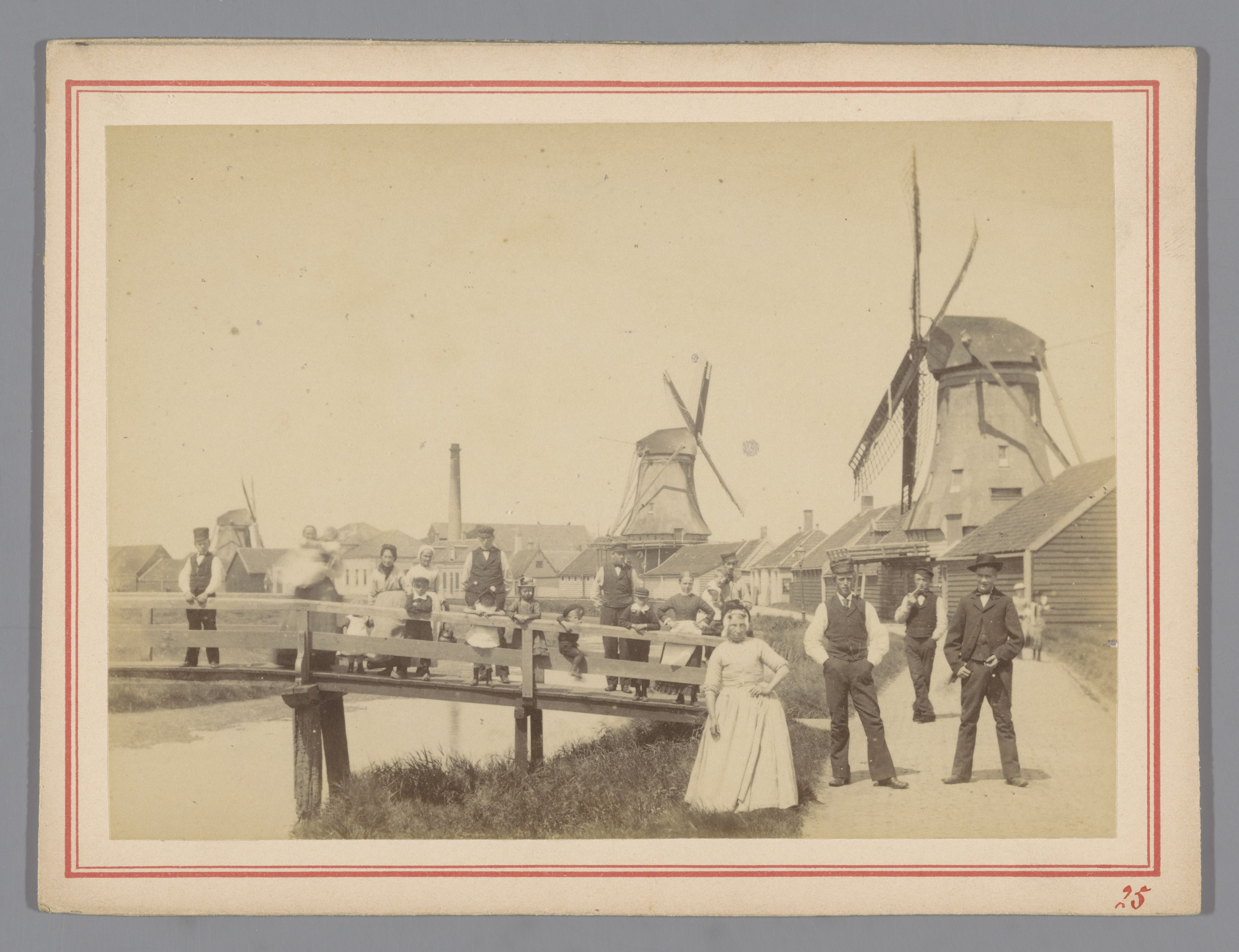 Groepsportret in klederdracht op een brug bij de mol...
