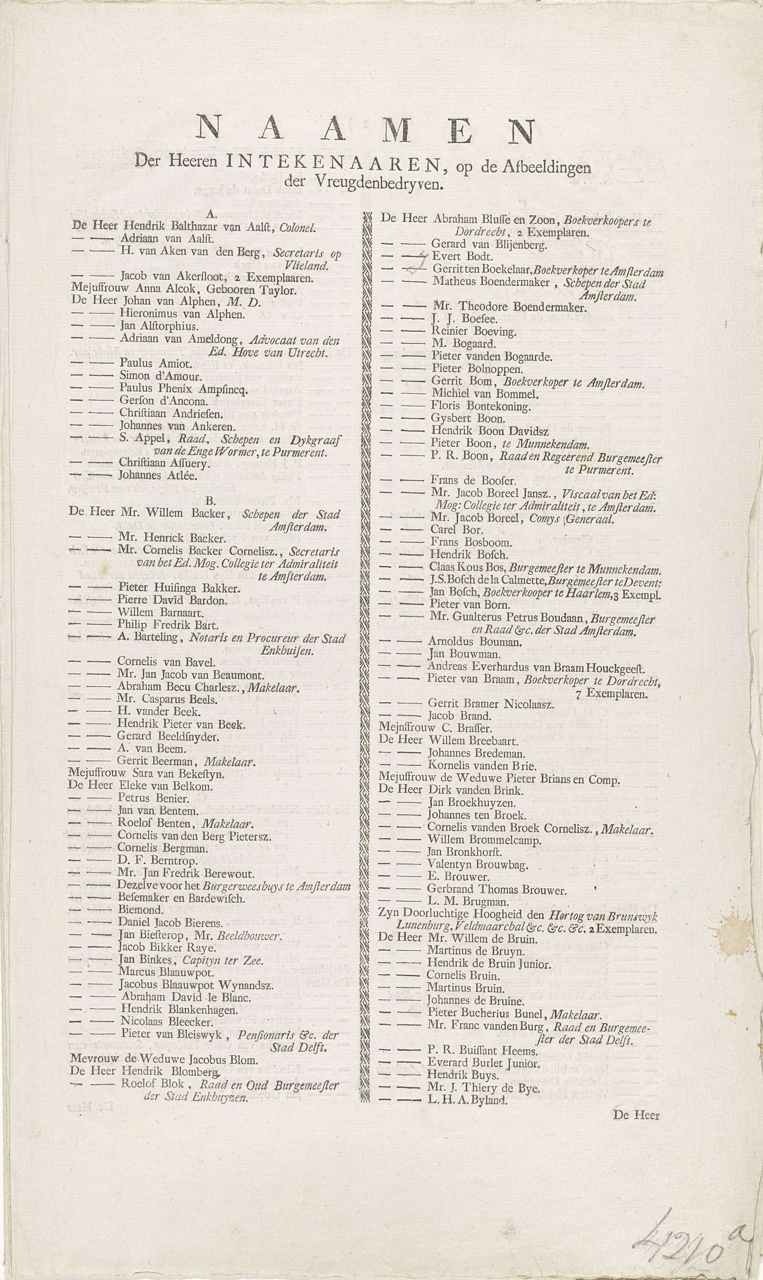 Namenlijst van de intekenaren op de prentserie van d...