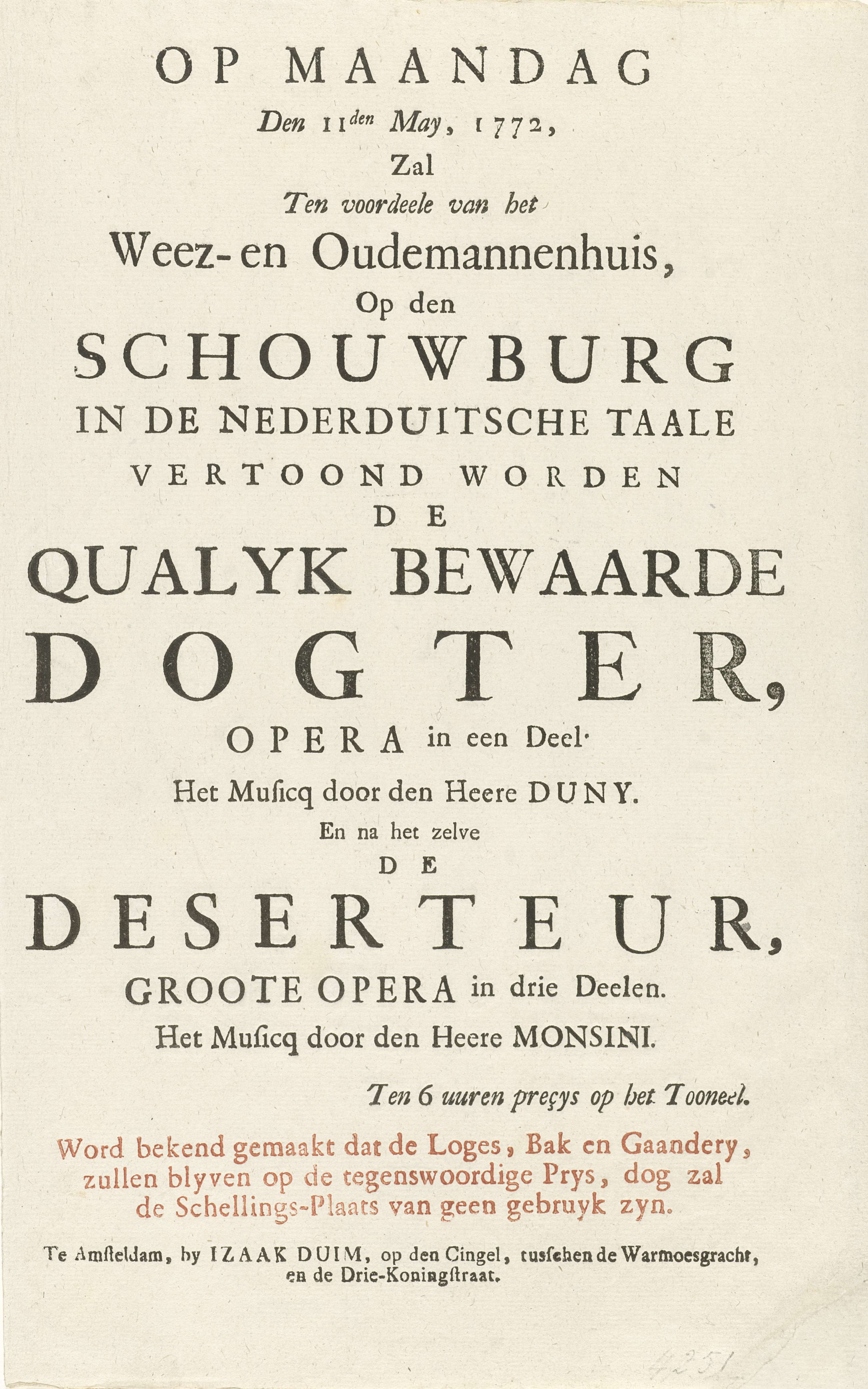 Toneelbiljet voor de vertoning van De Deserteur, 1772