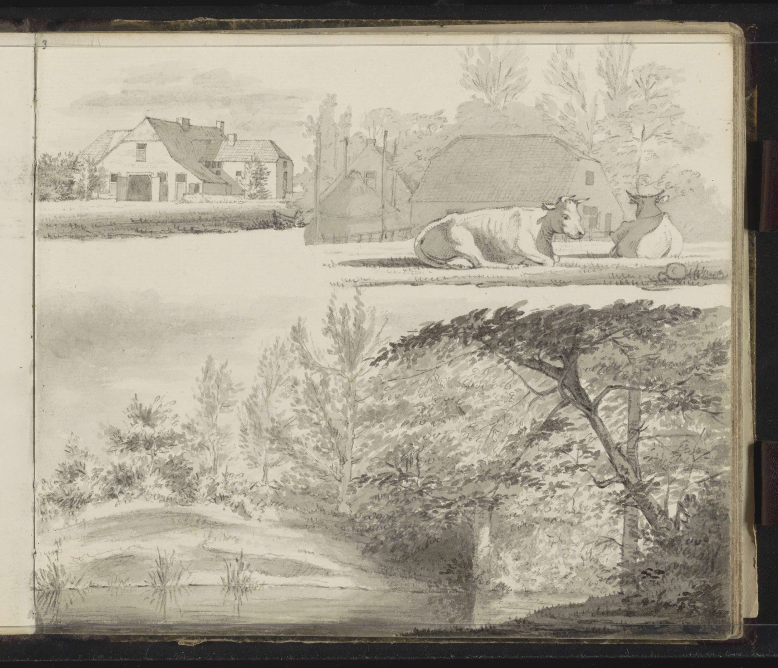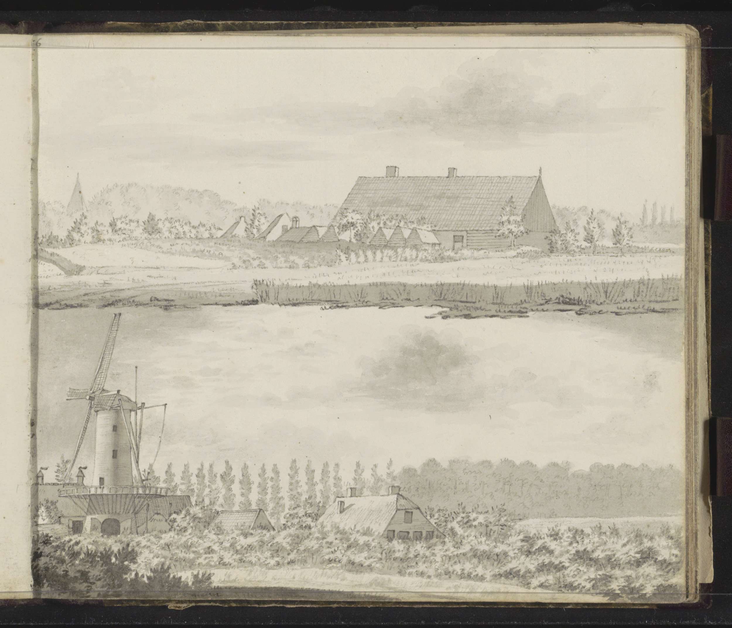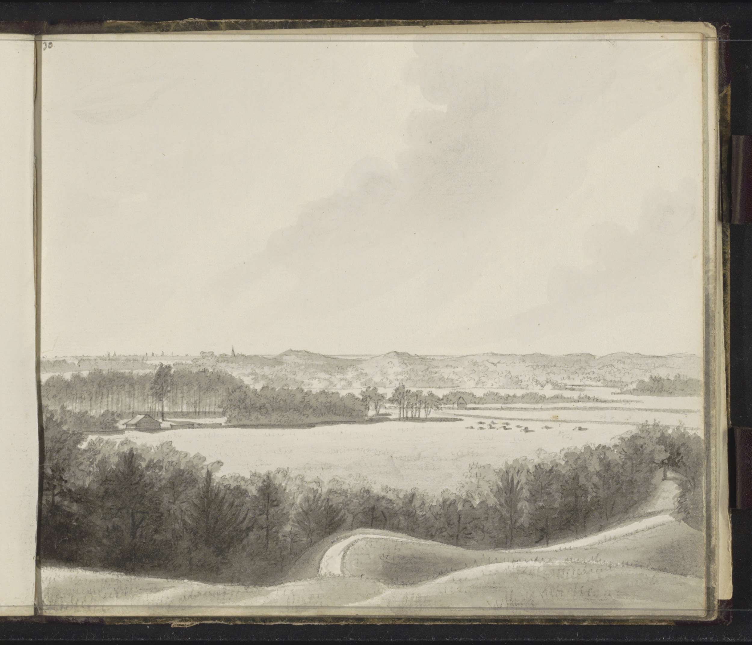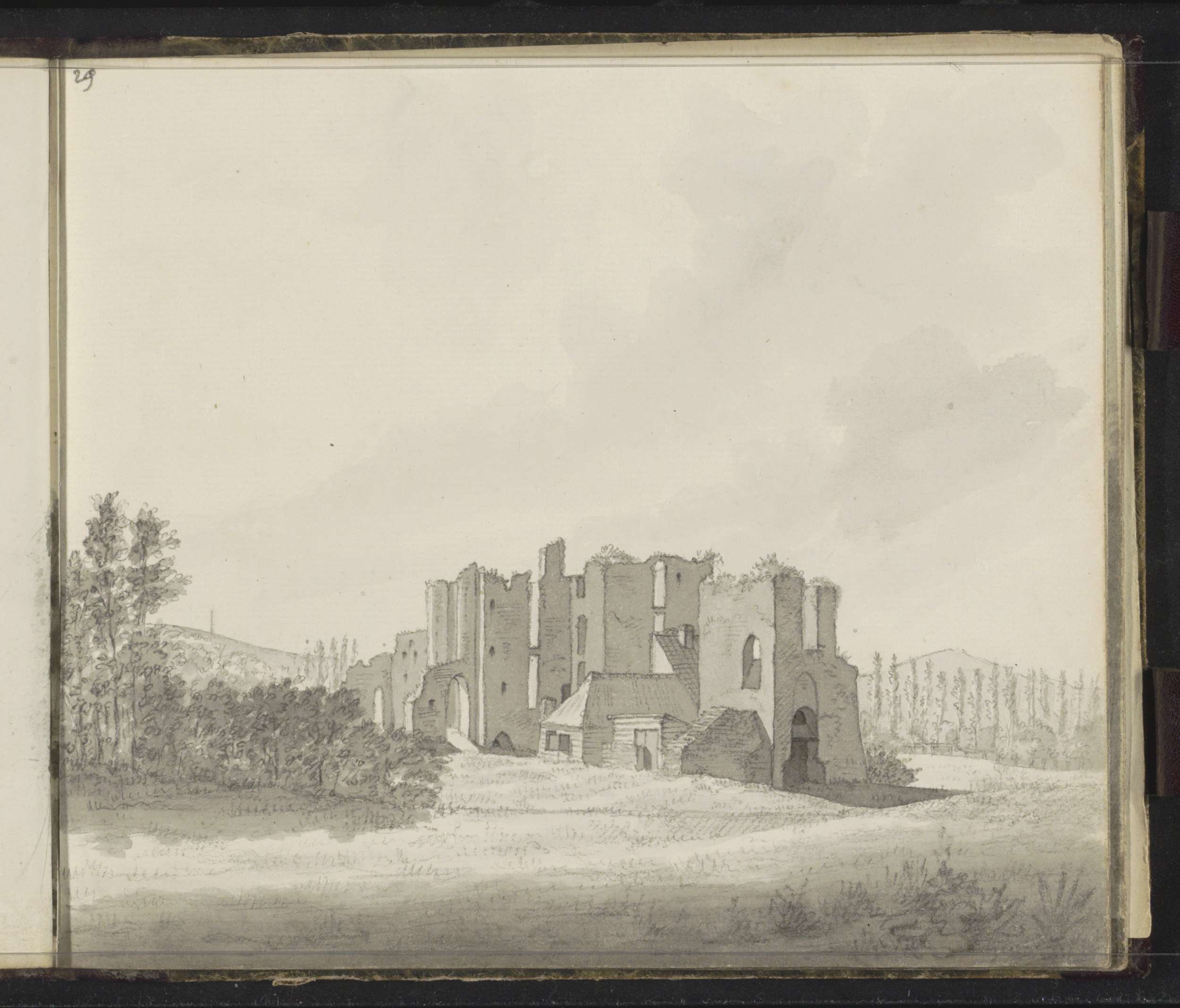Vlakte met schapen, op de achtergrond ruïnes van een...