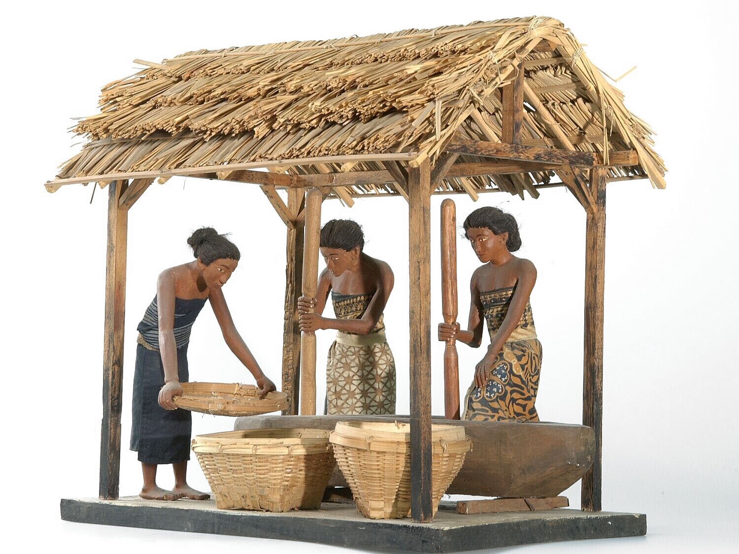 Model van drie vrouwen bezig met stampen en wannen v...