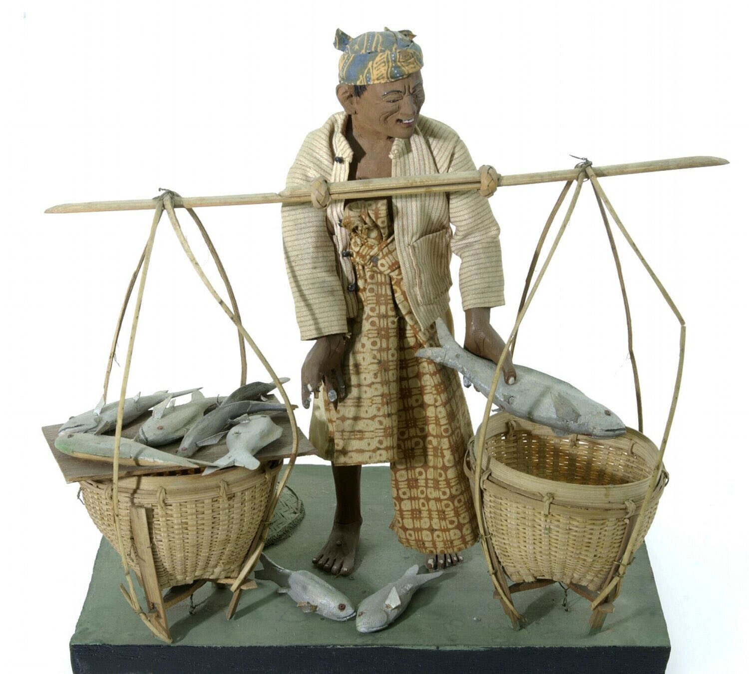 Model van een visverkoper met juk attributen