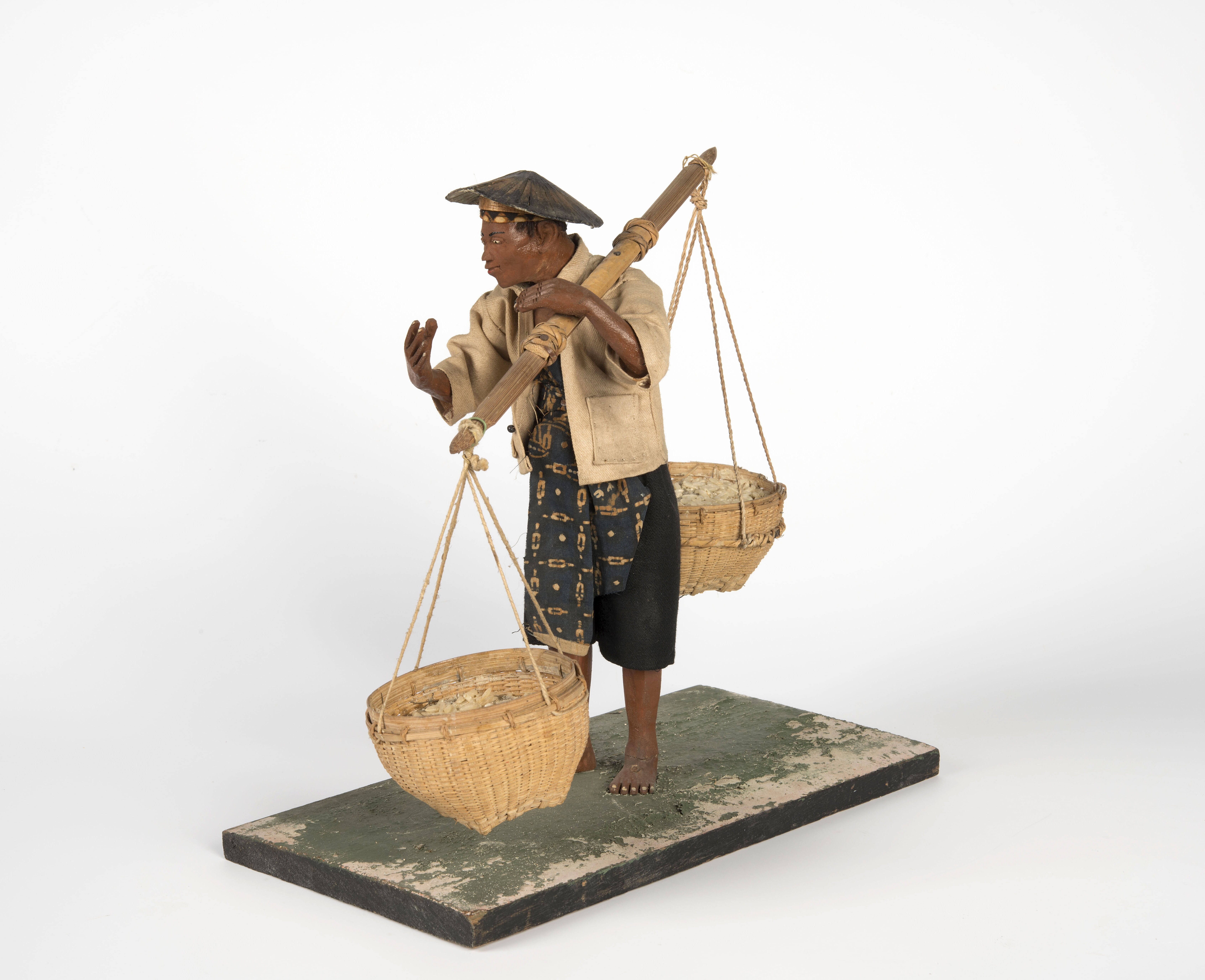 Model van een rijstverkoper met juk en twee manden