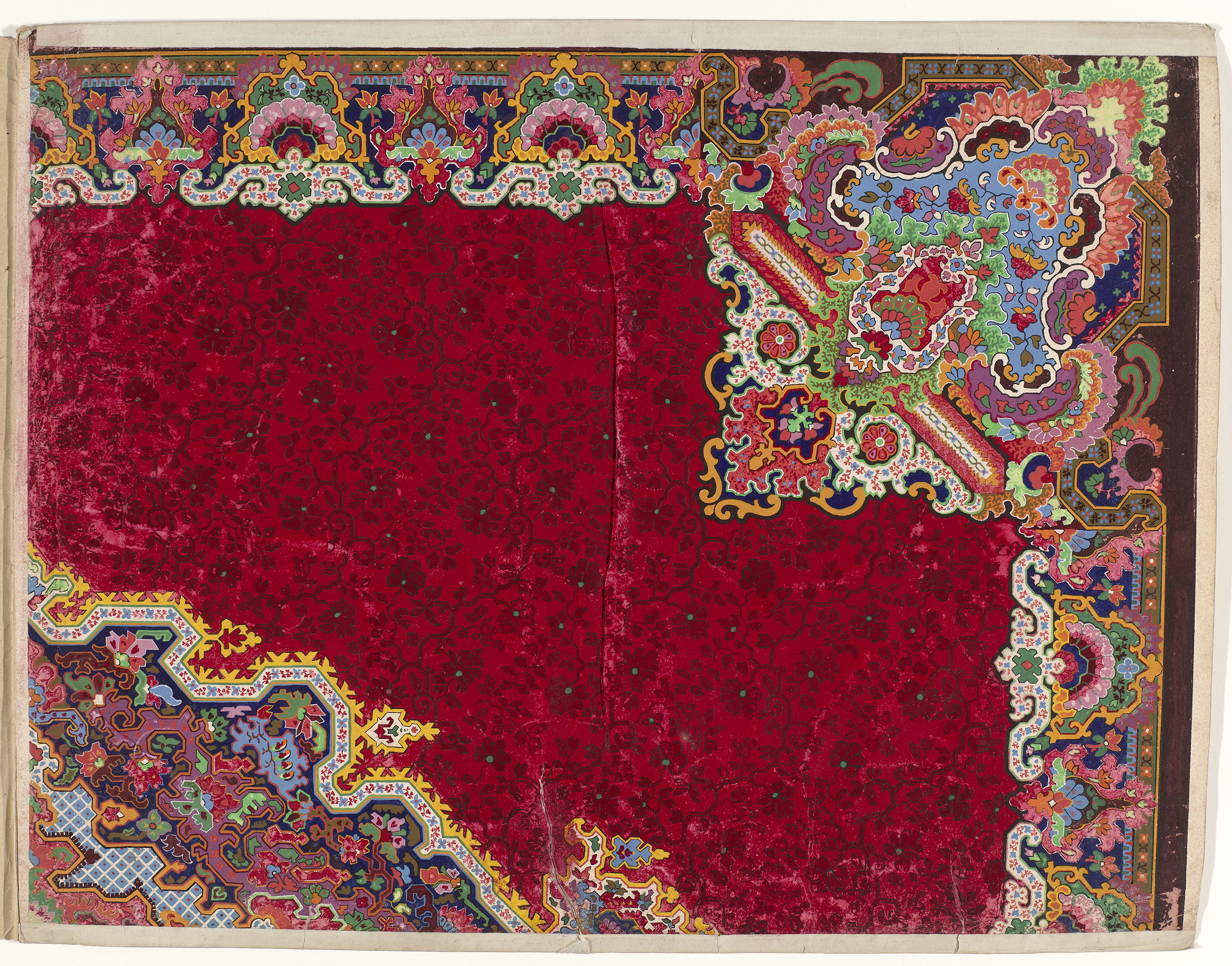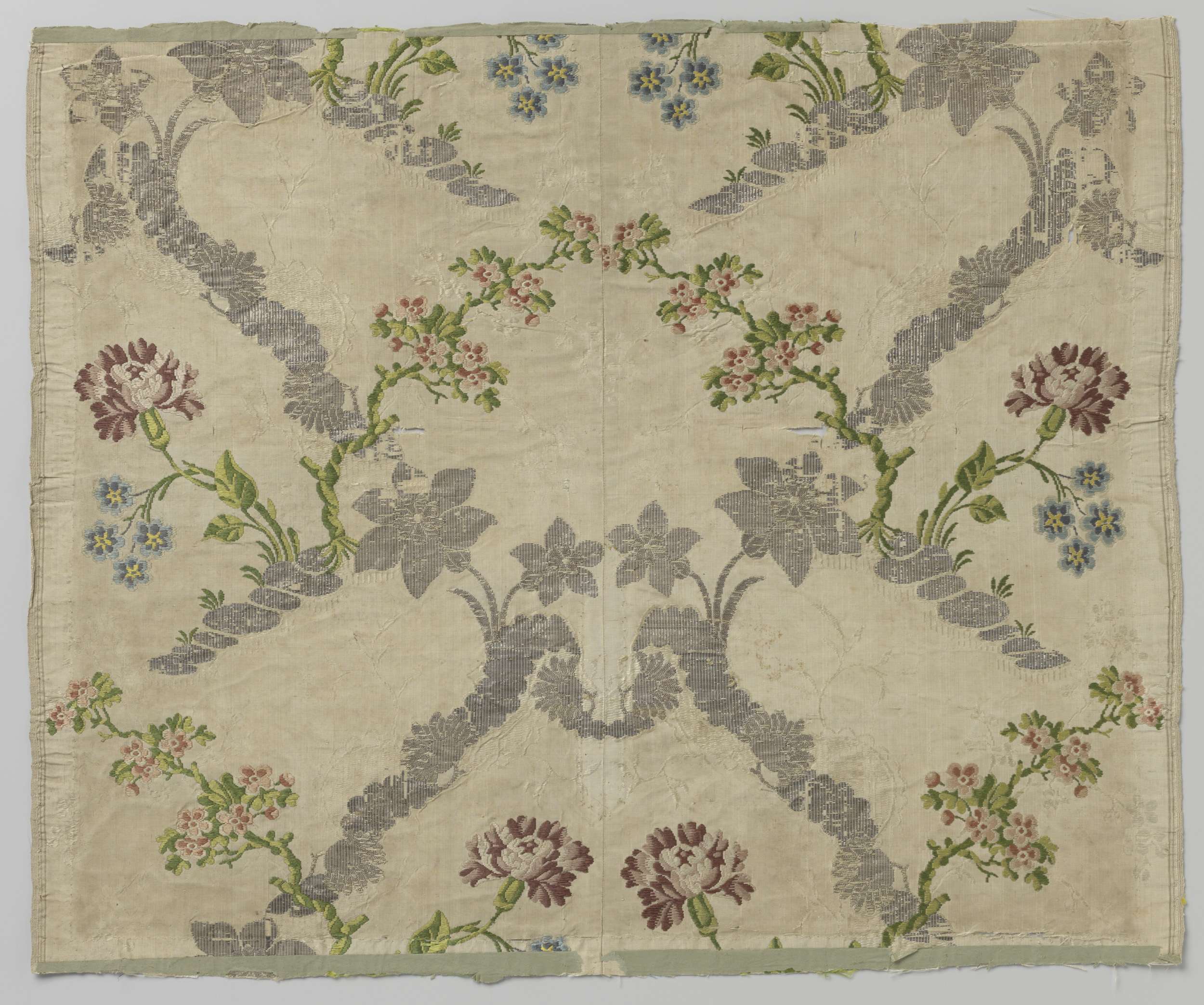 Fragment zijdeweefsel met kantpatroon en bloemenranken