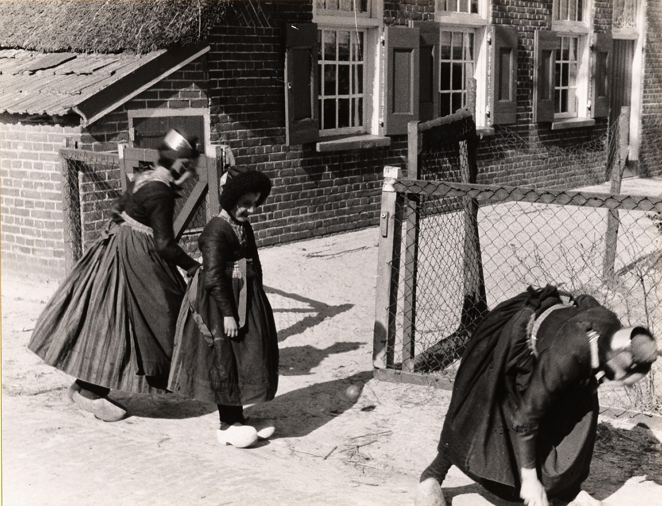 Balspel door drie meisjes, Staphorst, 1944 (zwart-wi...