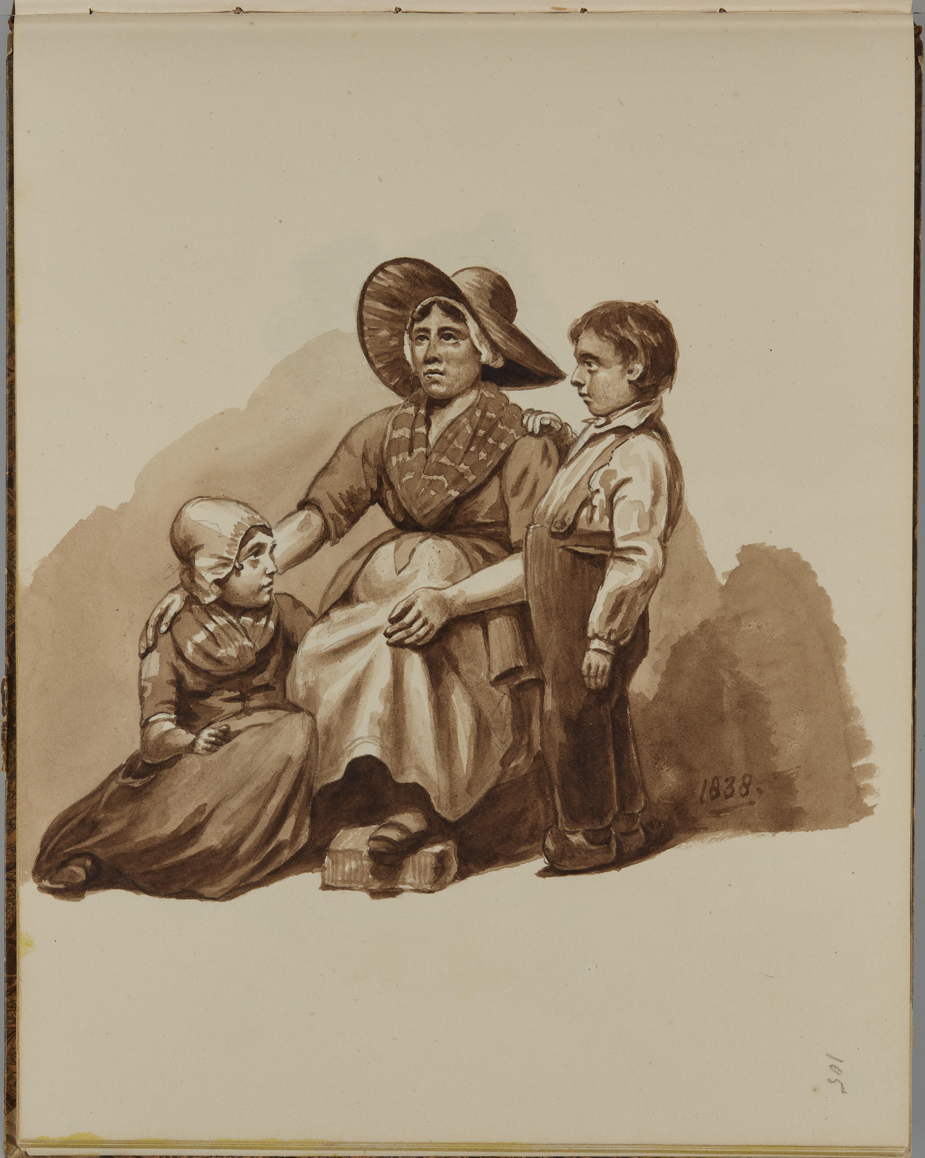 Tekening van Scheveningse vrouw met twee kinderen, 1838
