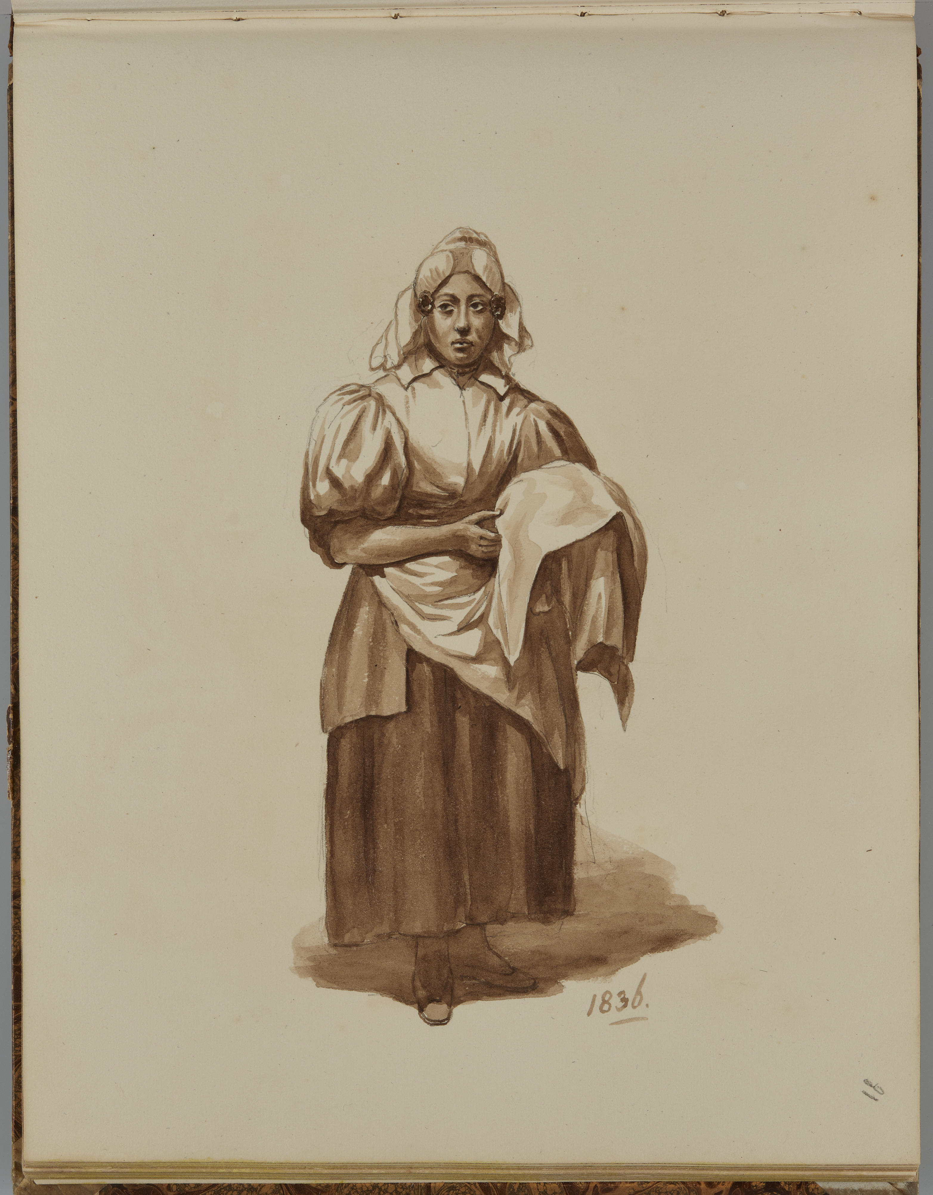 Lithografie van vrouw in Walcherse dracht, circa 1850