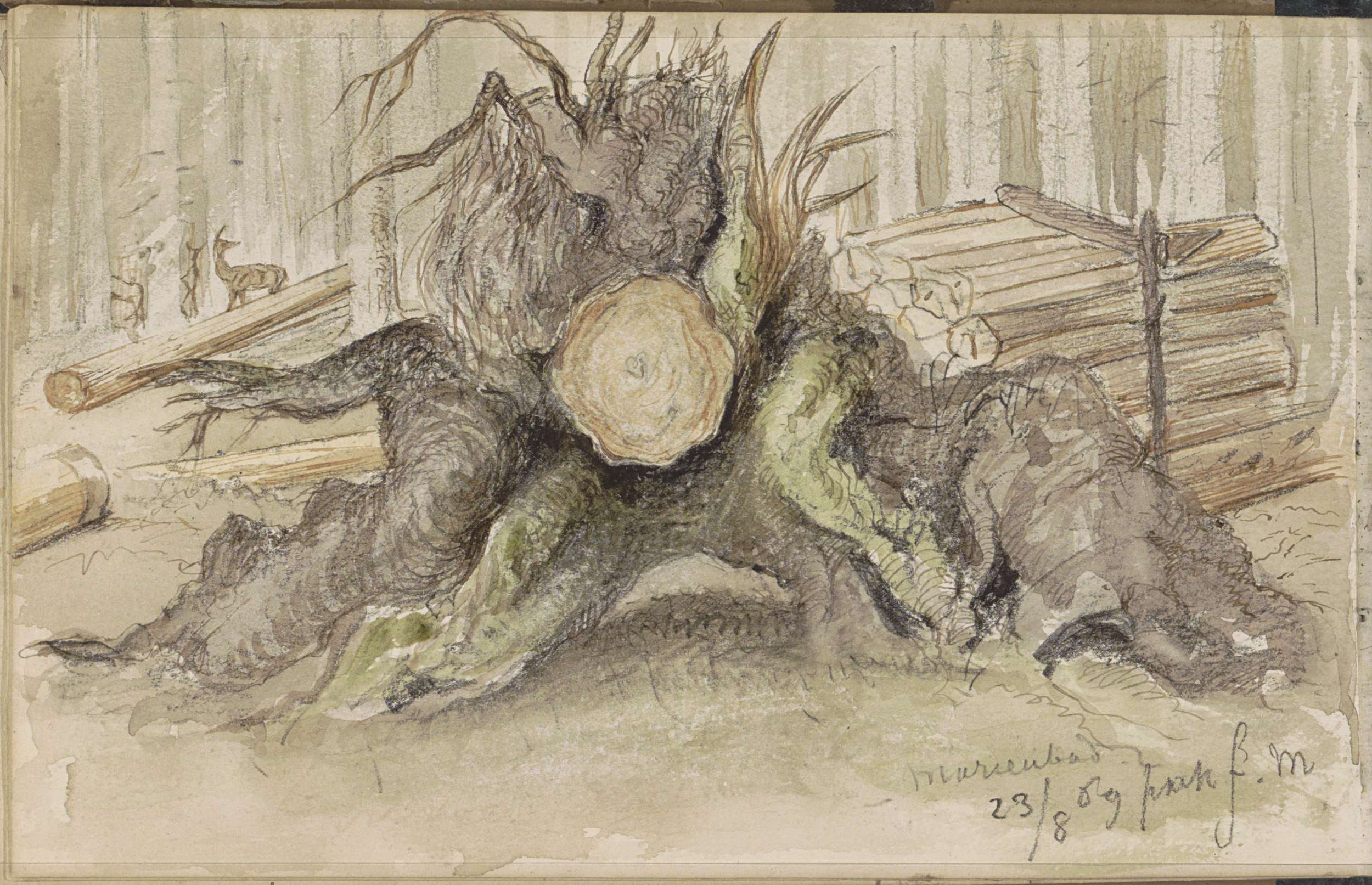 Halve boomstam en een stapel sprokkelhout in een bos...