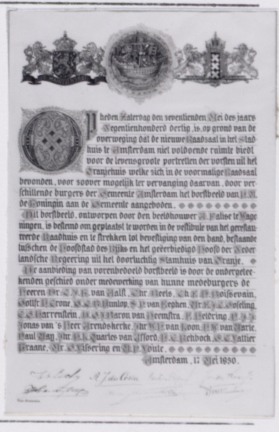 Oorkonde ter aanbieding van borstbeeld koningin Wilh...