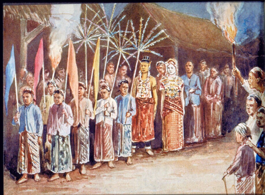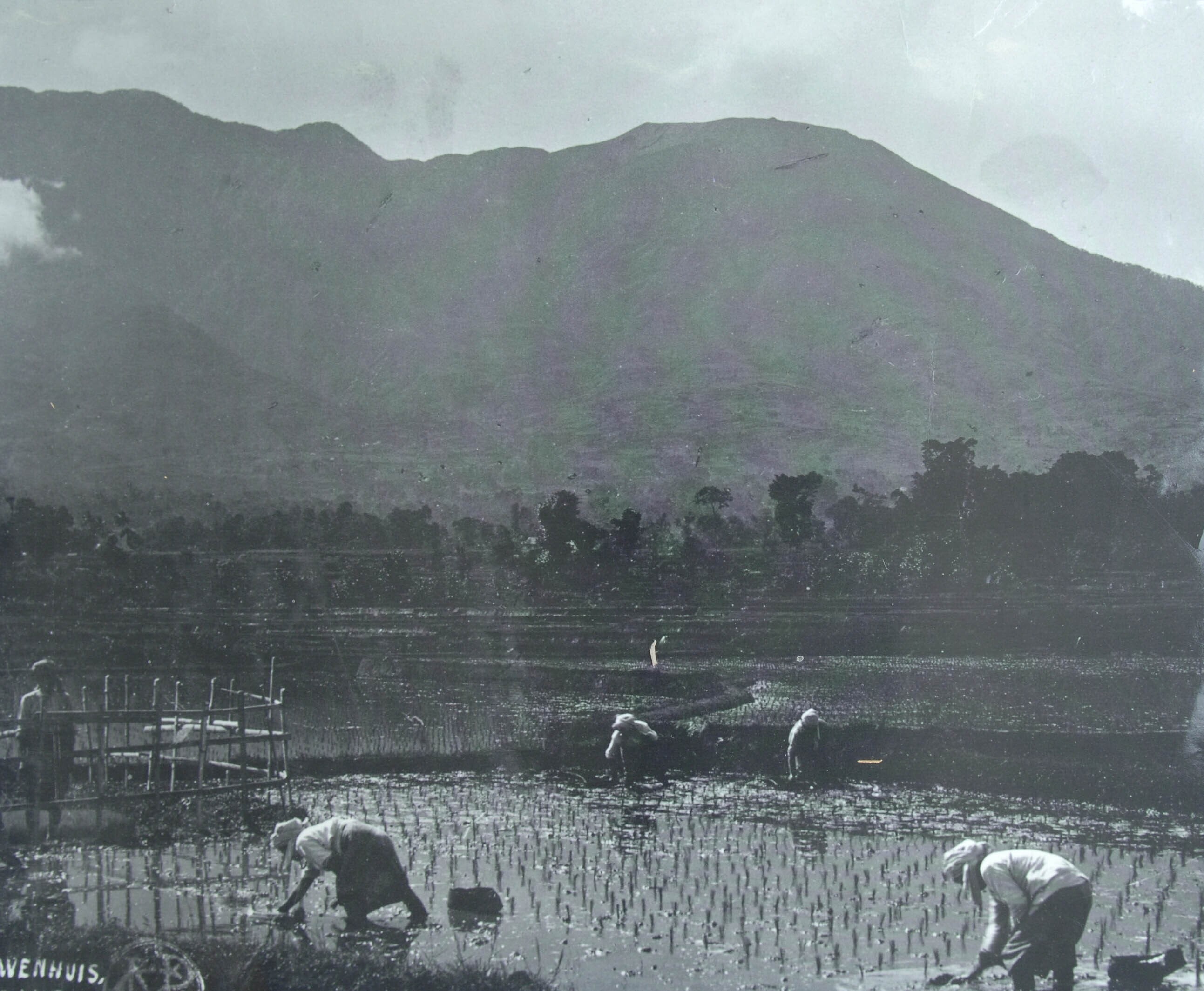Javaanse vrouwen planten de jonge rijstplanten in de...
