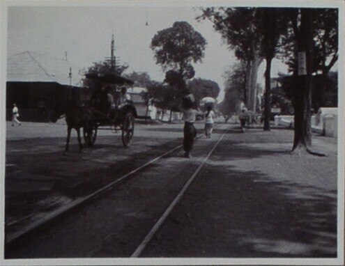 Dorpsstraat met treinrails, gebouwen, paard en wagen...
