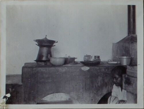 Interieur van een keuken met Javaanse vrouw naast ee...