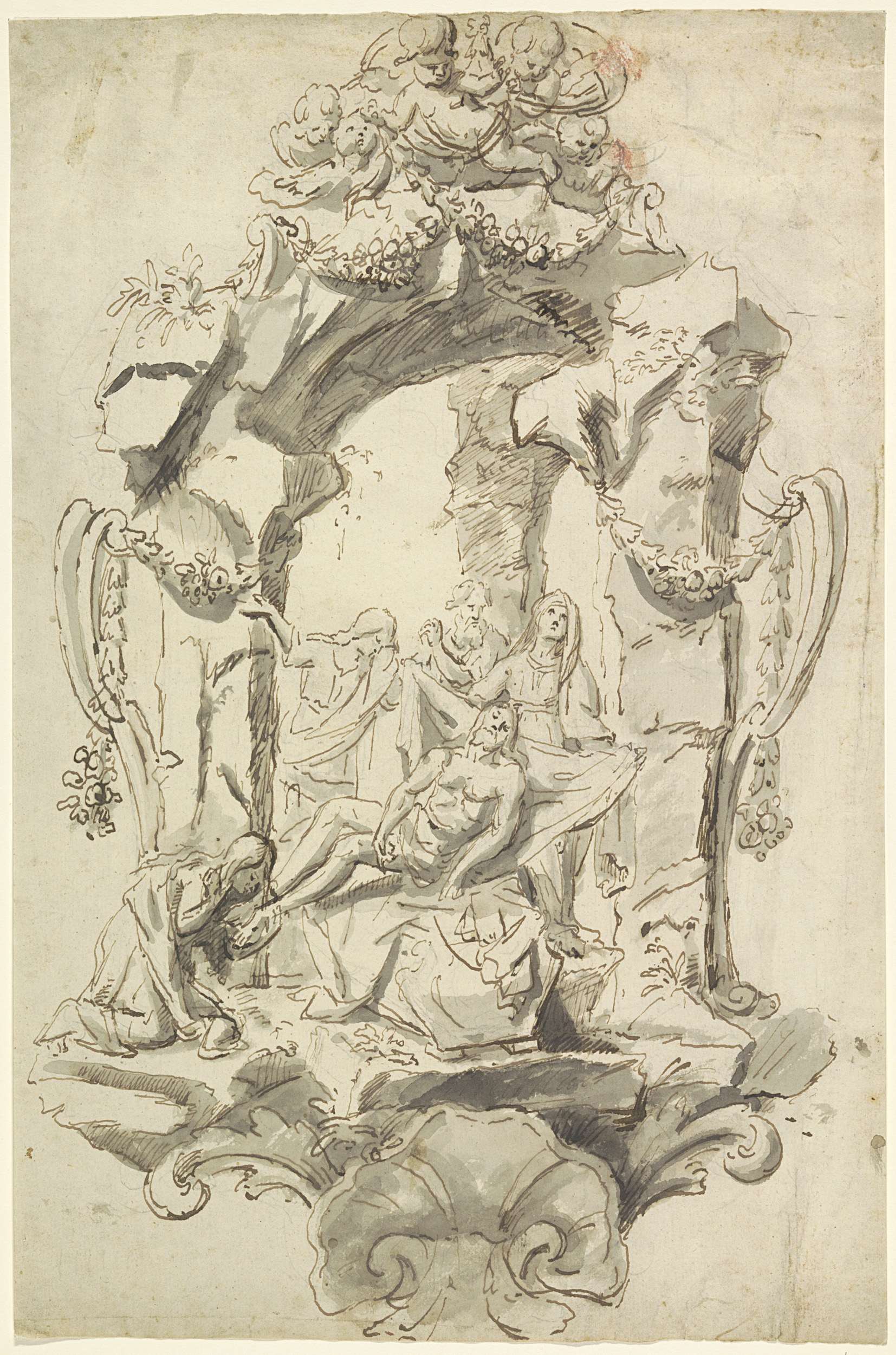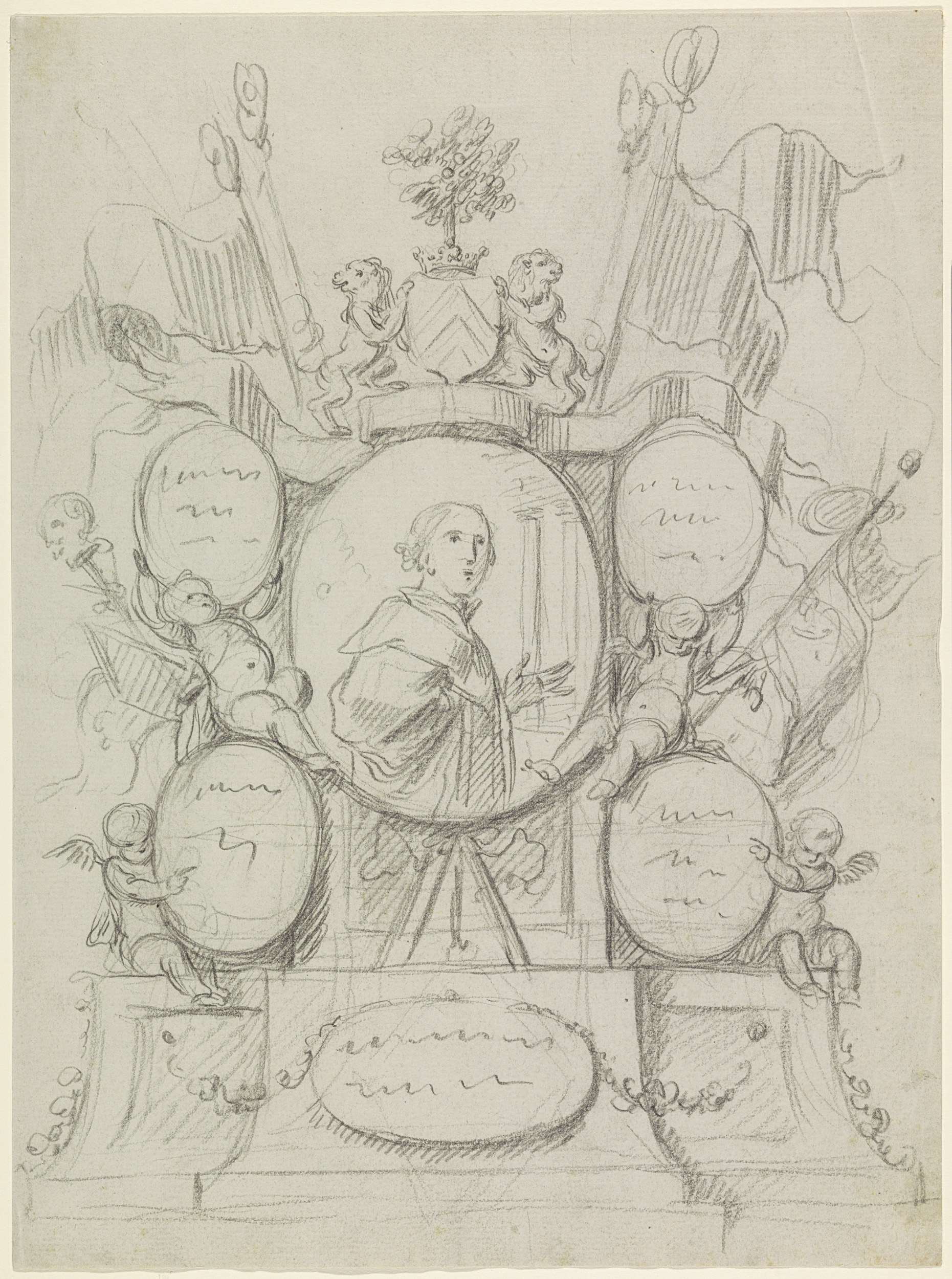 Decoratief ontwerp met putti en bloemen