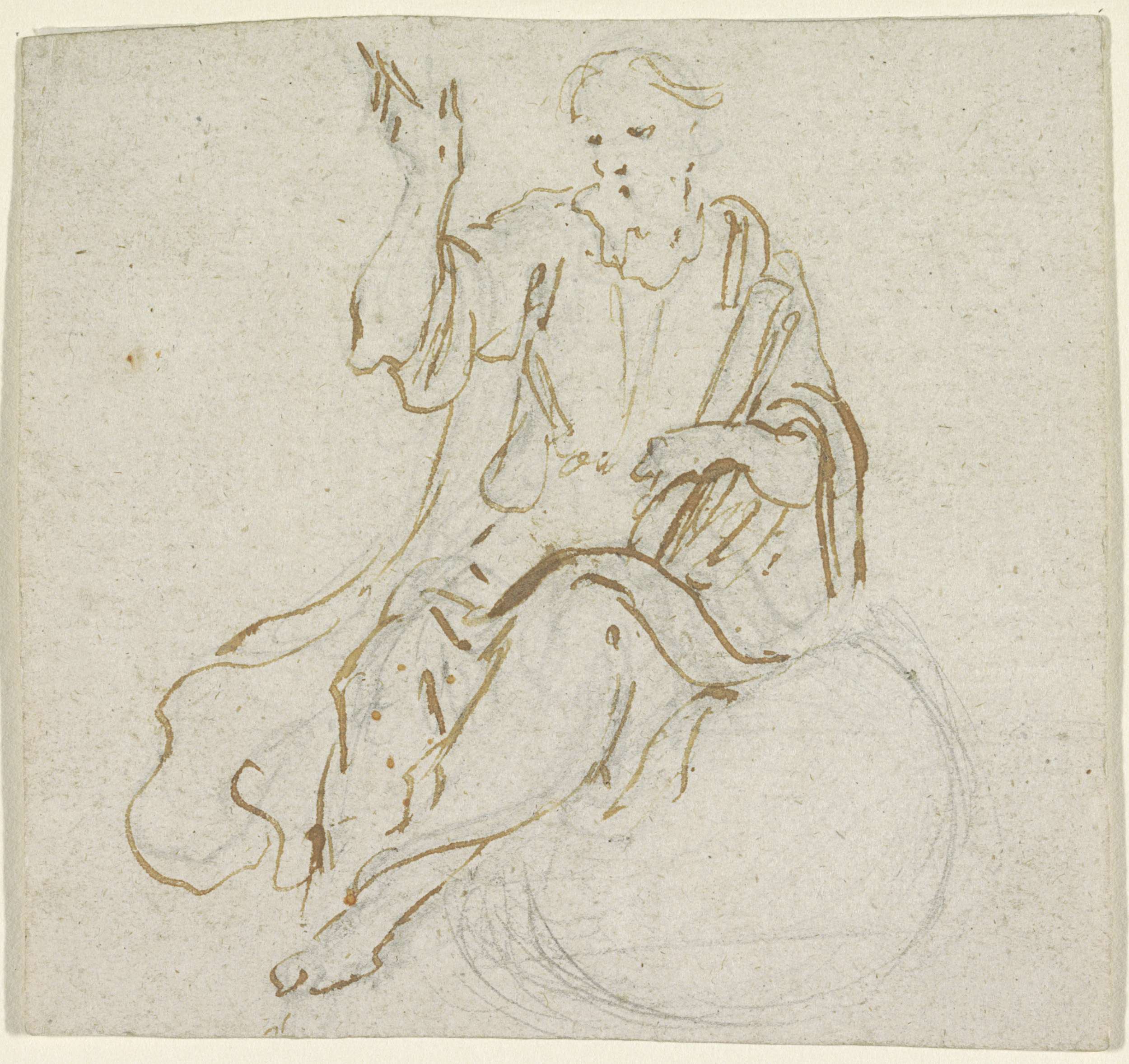 Zittende vrouw, de rechterarm steunend op een kussen