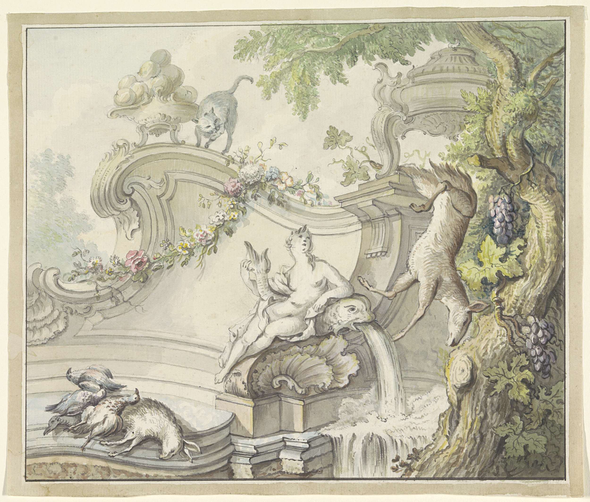 Fontein met vrouw en jachtbuit