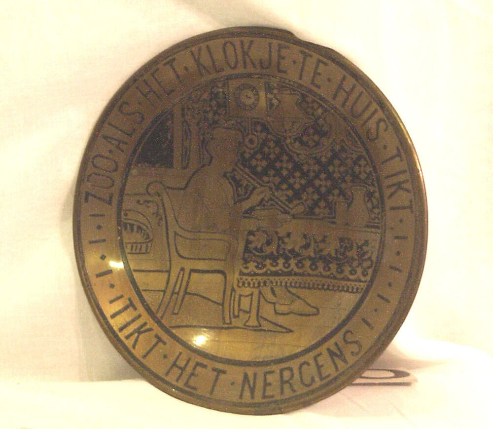 Wandbord van koper met de tekst ´Zoo als het klokje ...