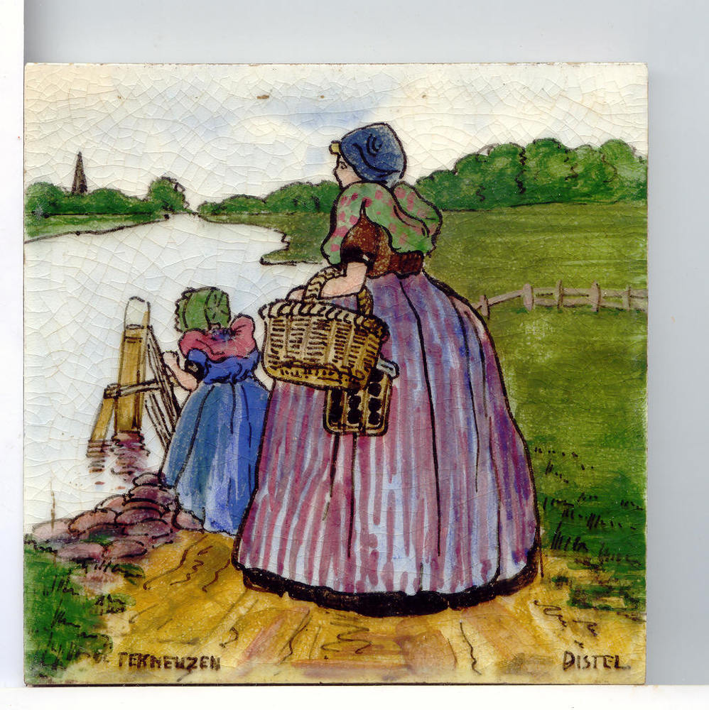 Tegel in tinglazuur, voorstellende decor 'Eén junite...