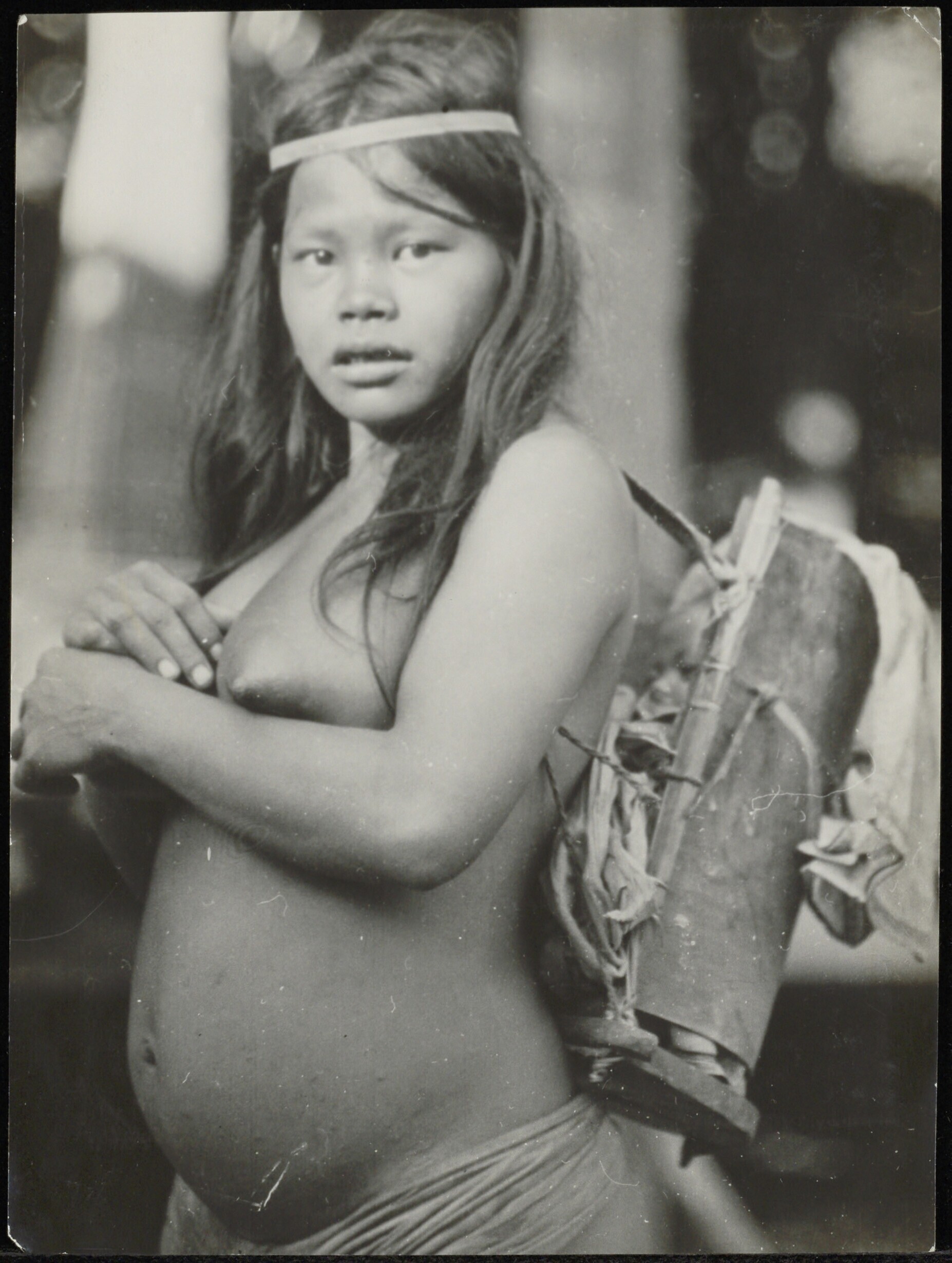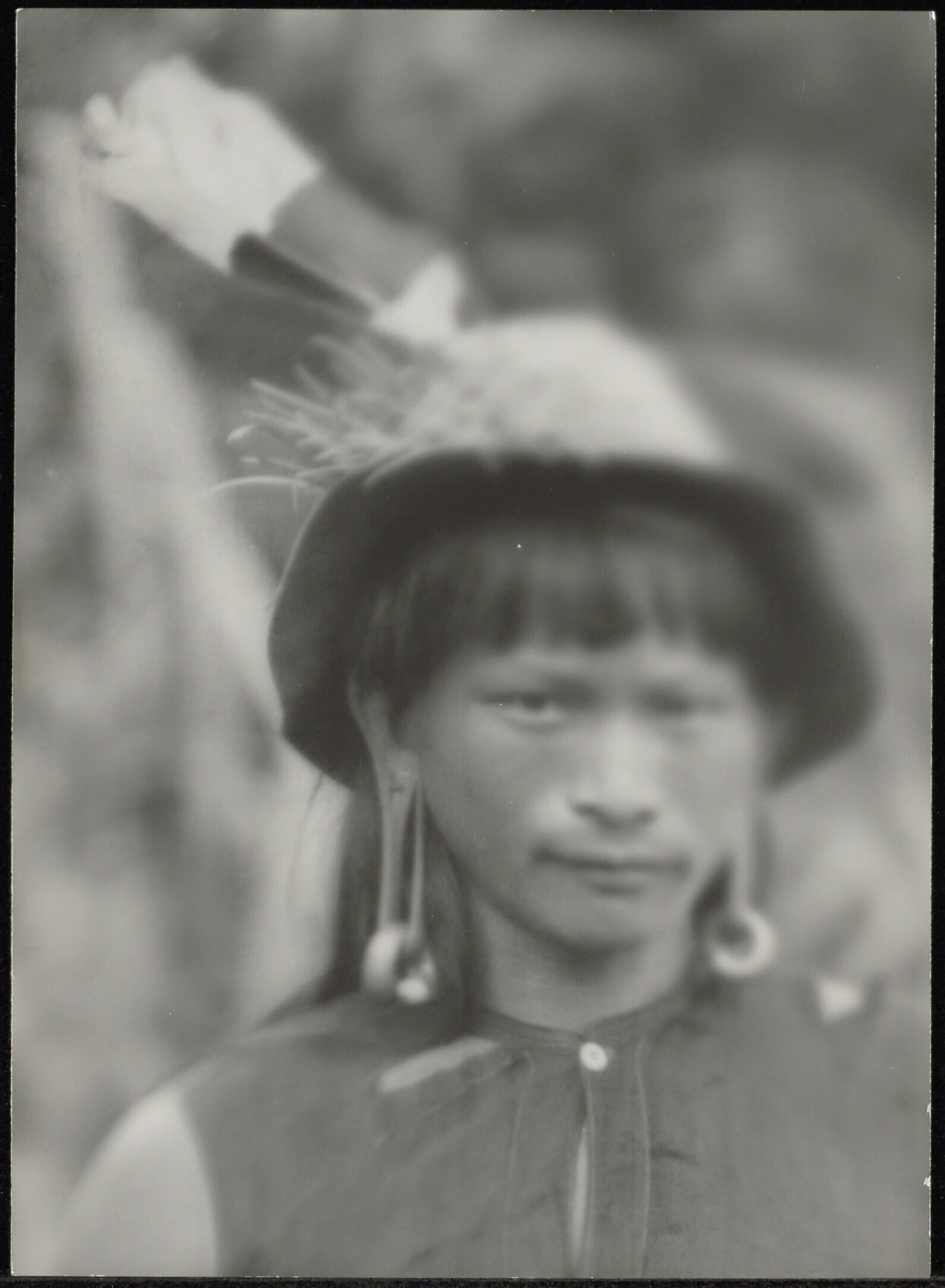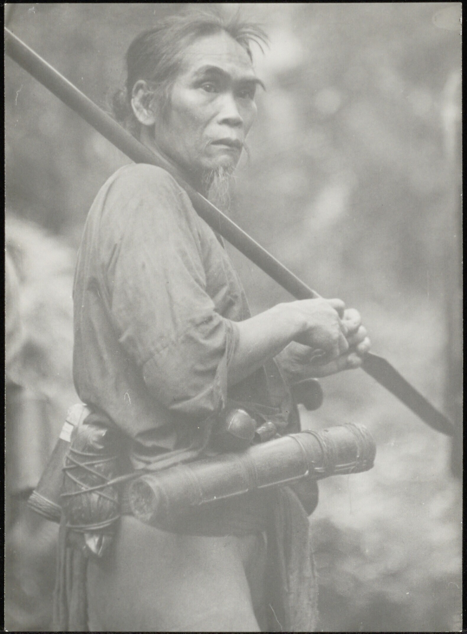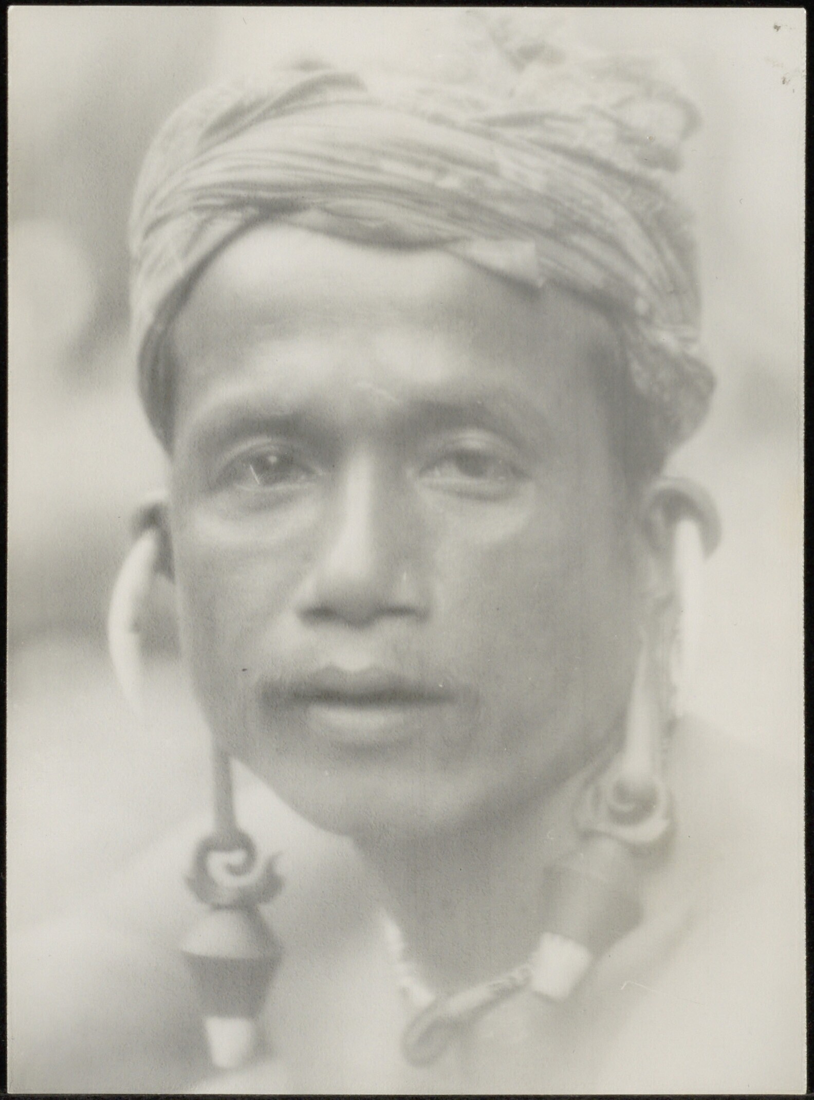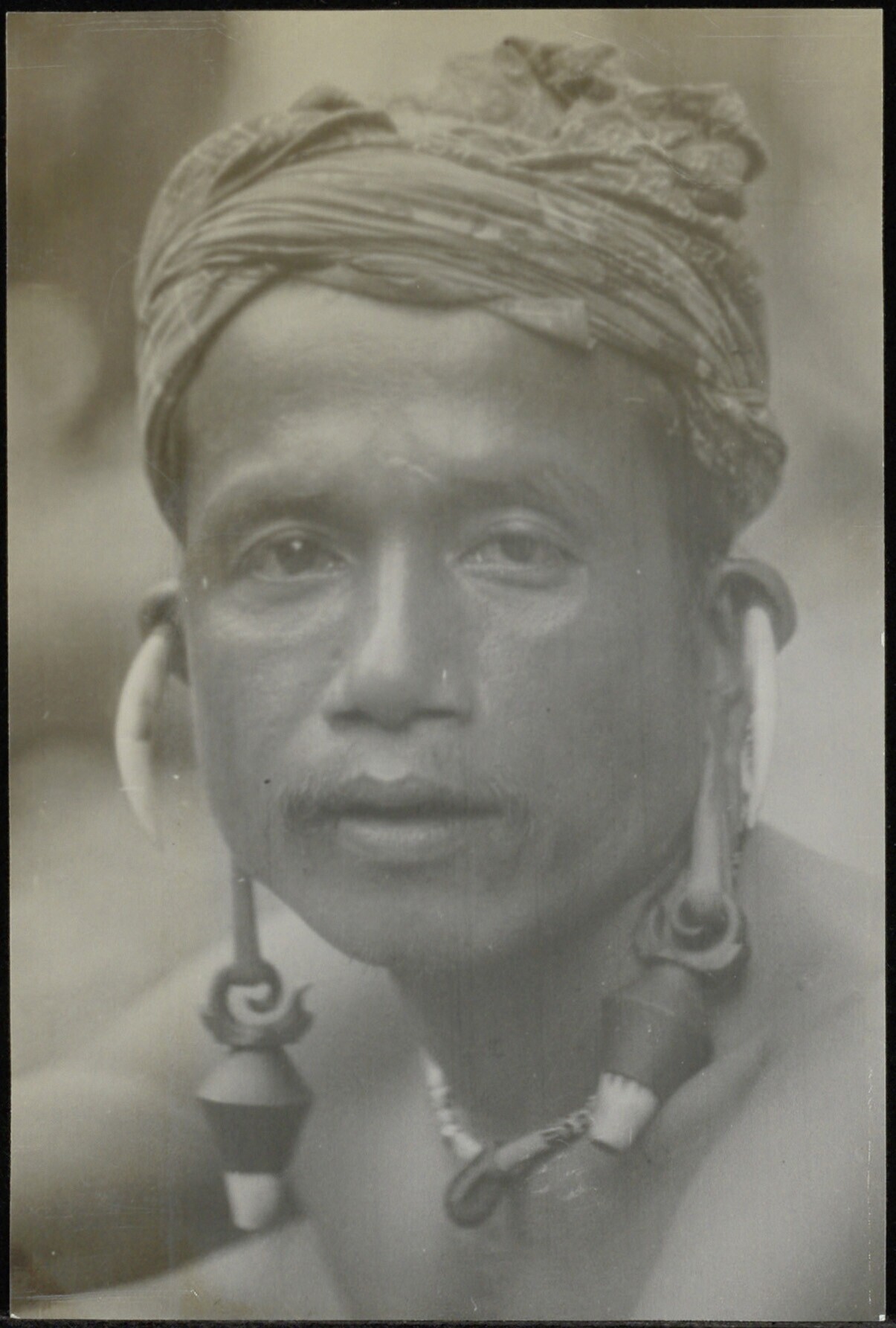Portret van een Segai-Dajak met een hoofddoek en oor...