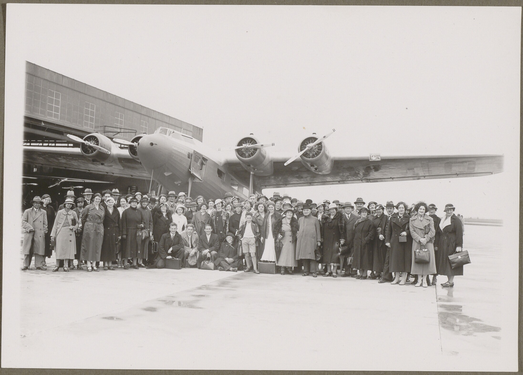 Passagiers poseren voor een vliegtuig op de luchthav...