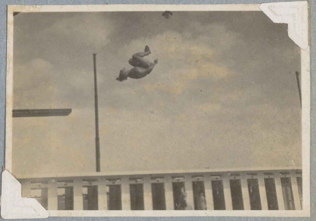 Zwemmer maakt een salto in de lucht tijdens zwemkamp...