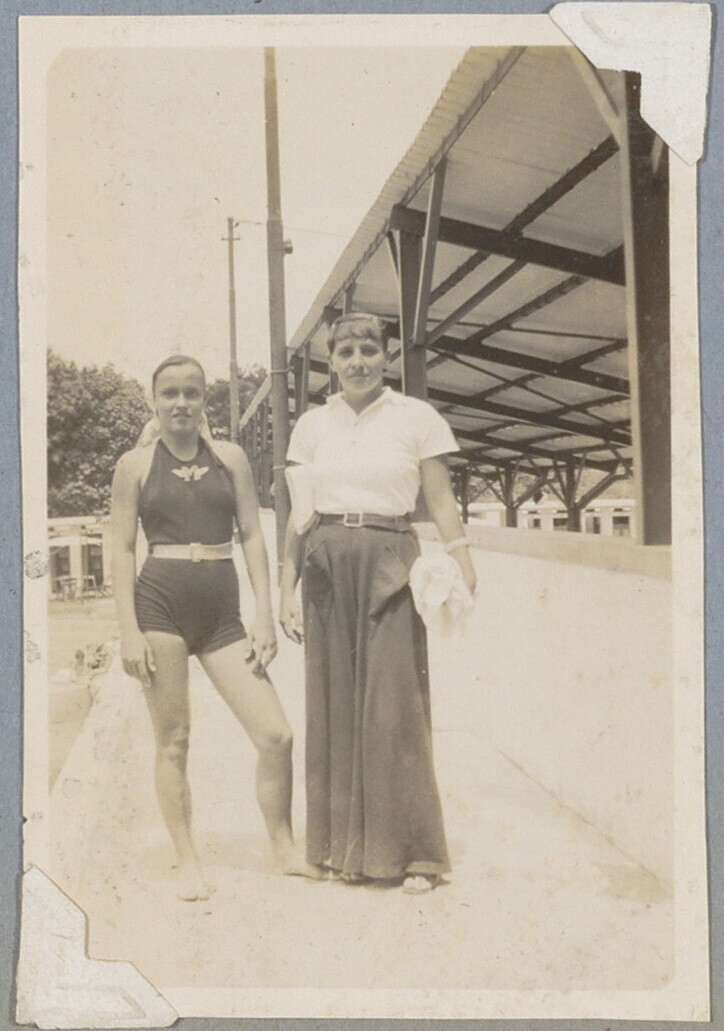 Twee vrouwen tijdens zwemkampioenschappen in Batavia