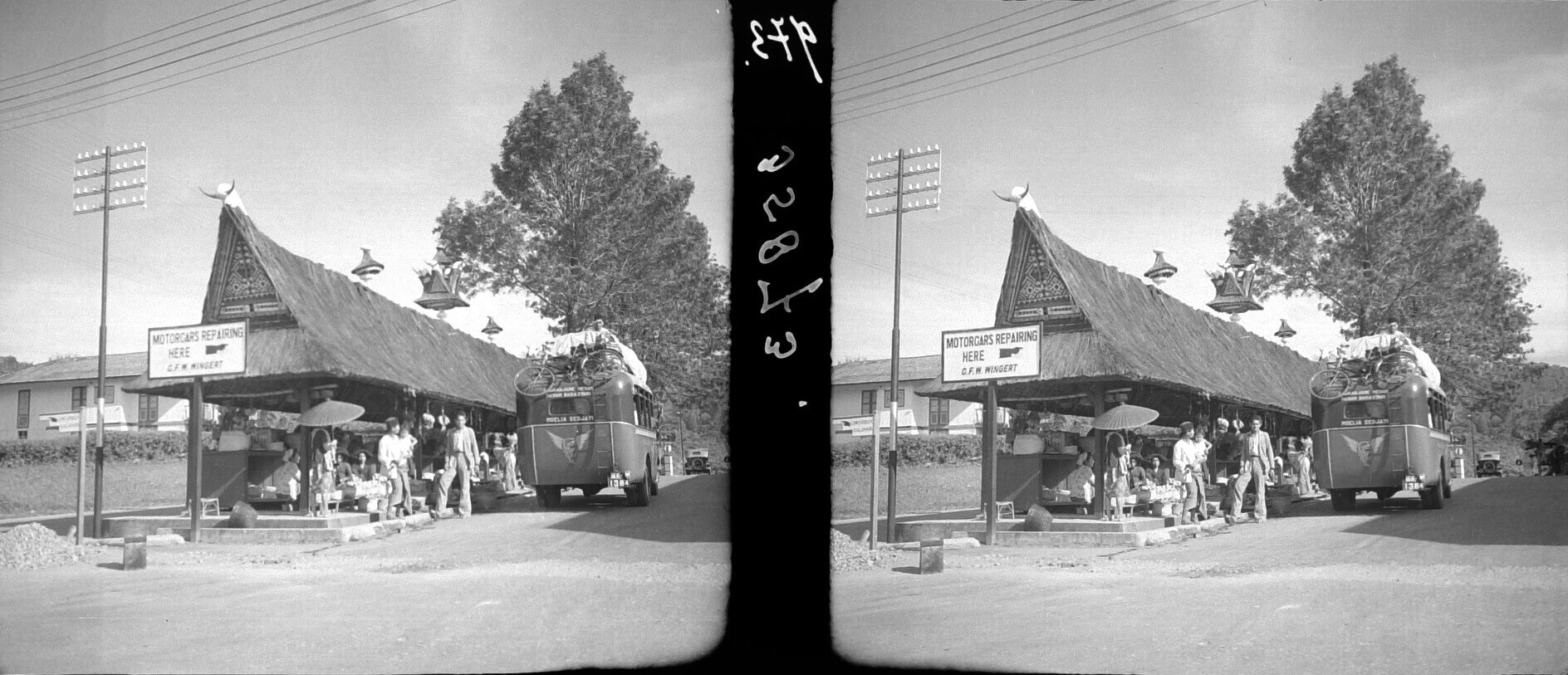Pasarloods met autobus ervoor, Brastagi