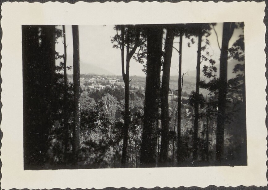 Uitzicht tussen de bomen door, in de vallei met aan ...