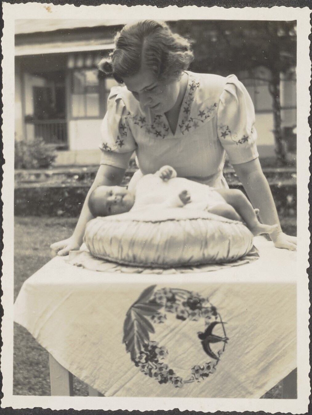Vrouw bekijkt een baby op een kussen in de tuin