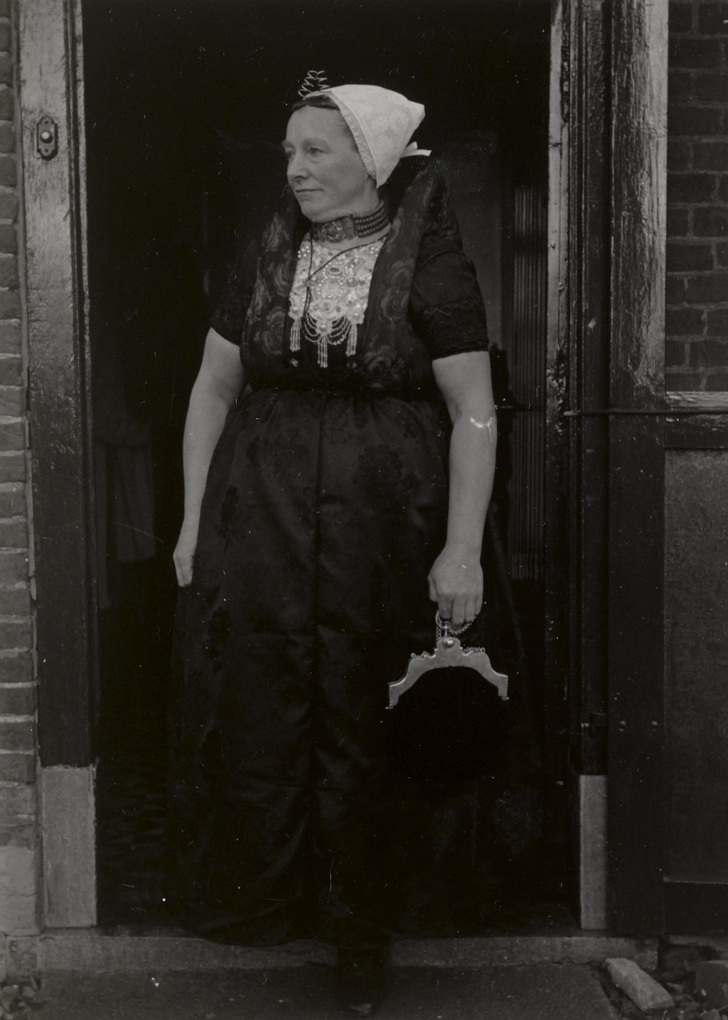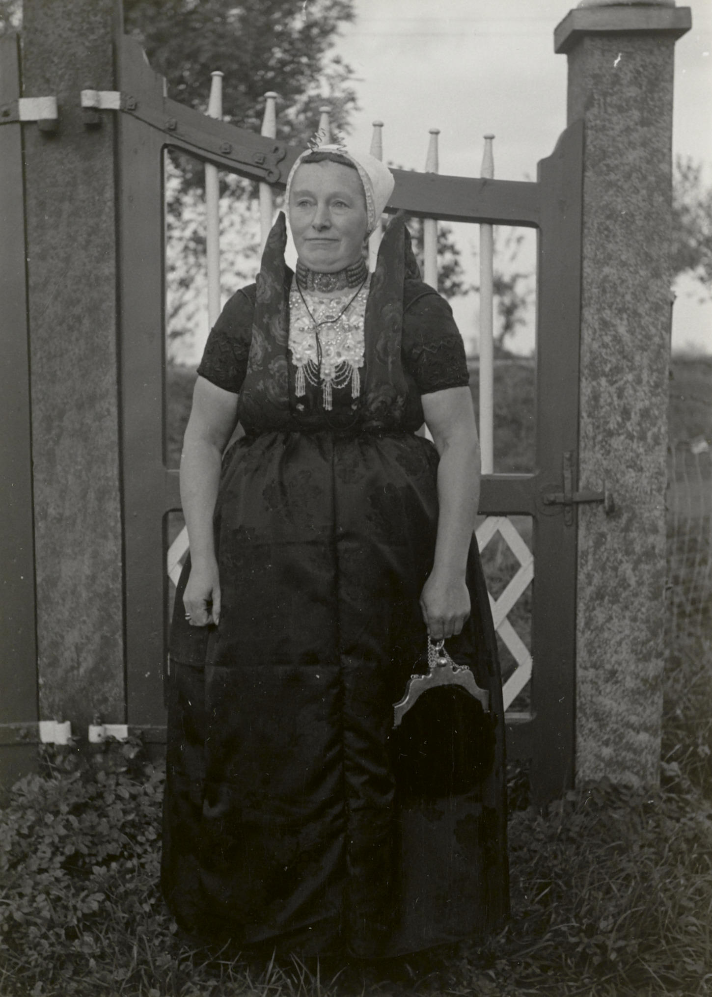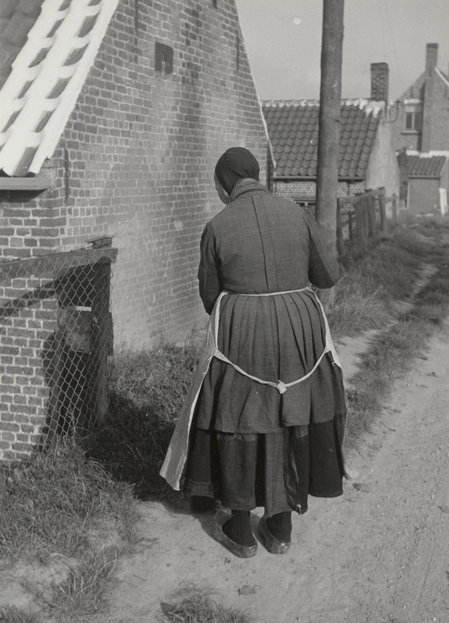 Vrouw in Cadzandse dracht, 1950 (zwart-wit foto)