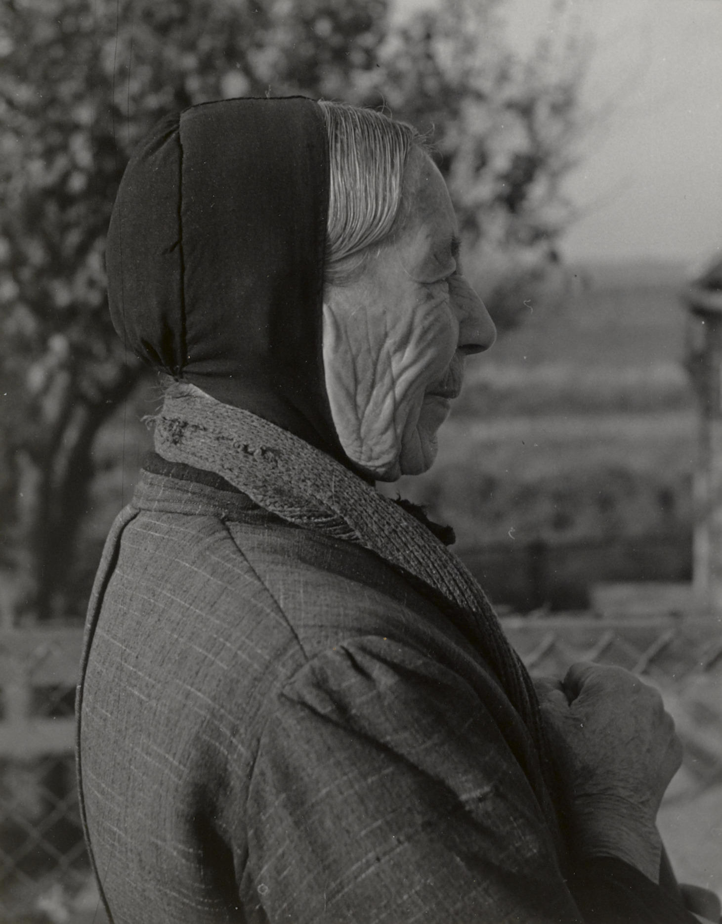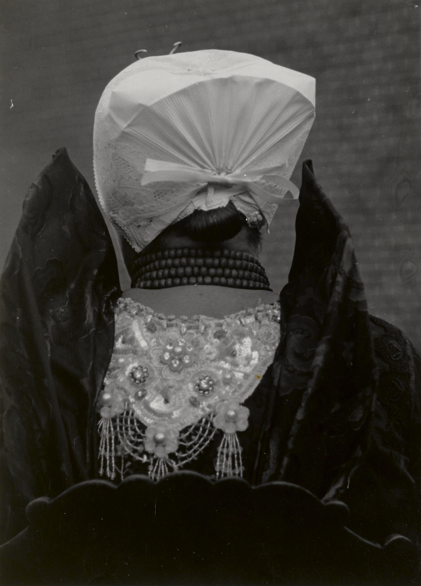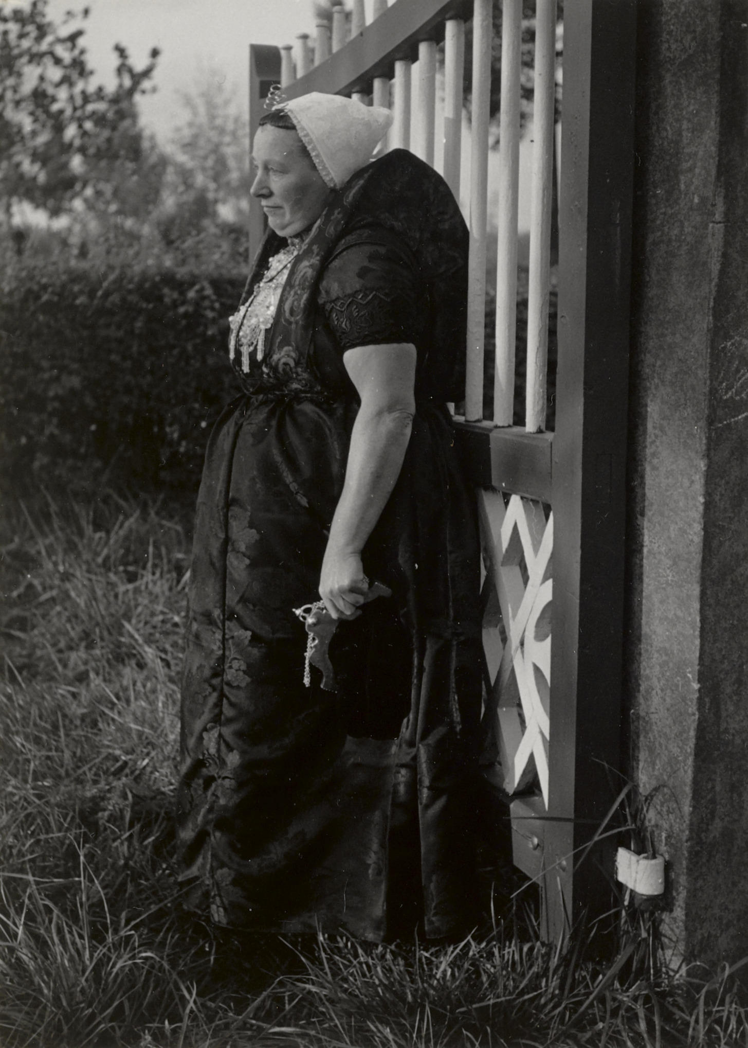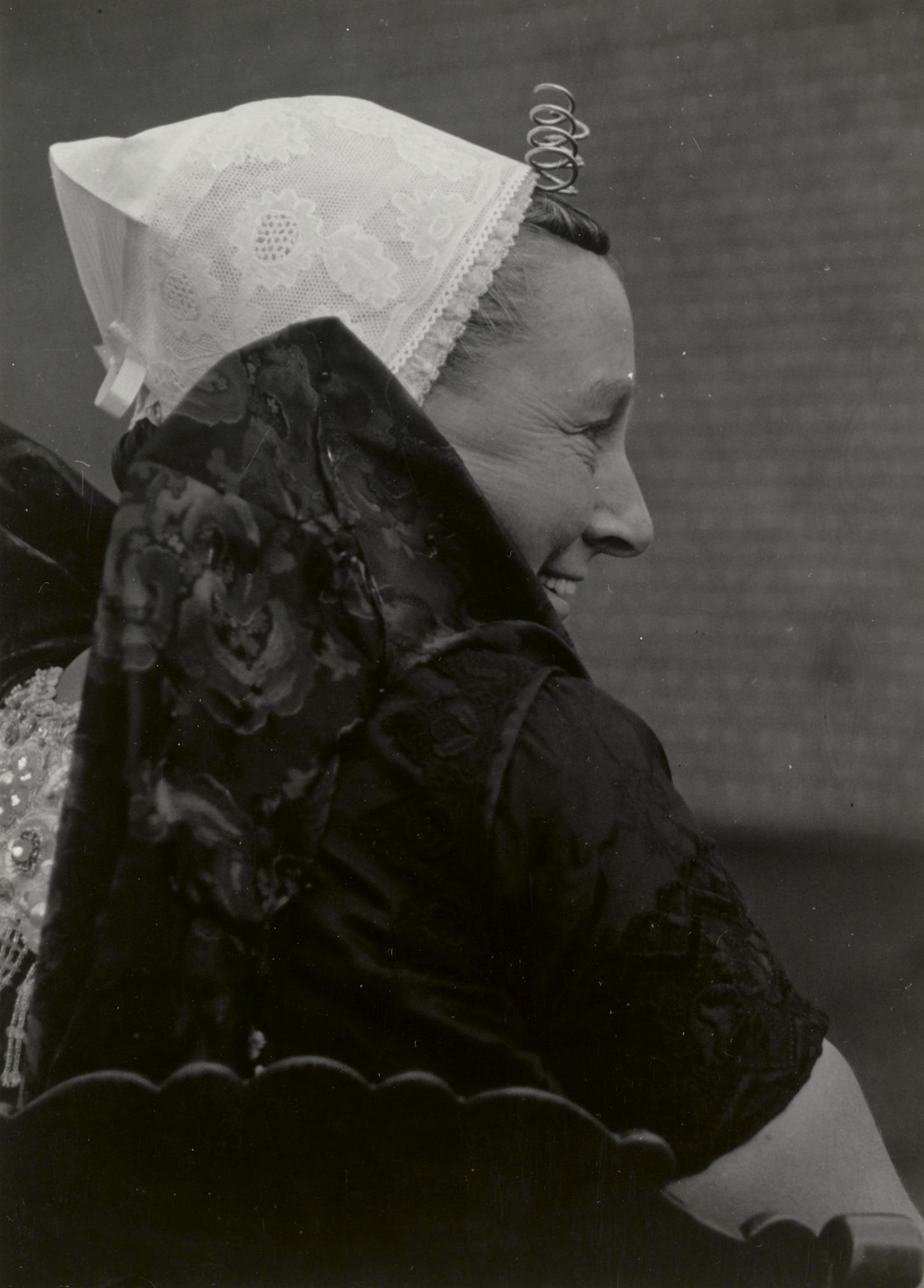 Vrouw in Cadzandse dracht, 1950 (zwart-wit foto)