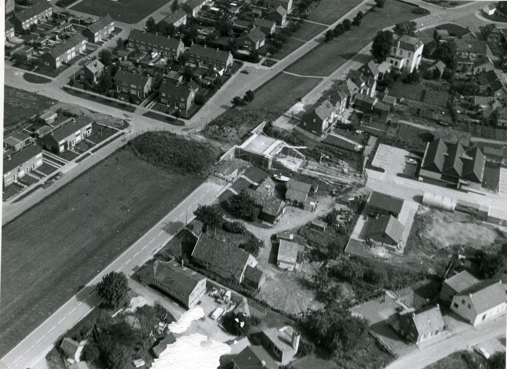 Zwart-wit luchtfoto van het dorp Lobith ca. 1950-1980