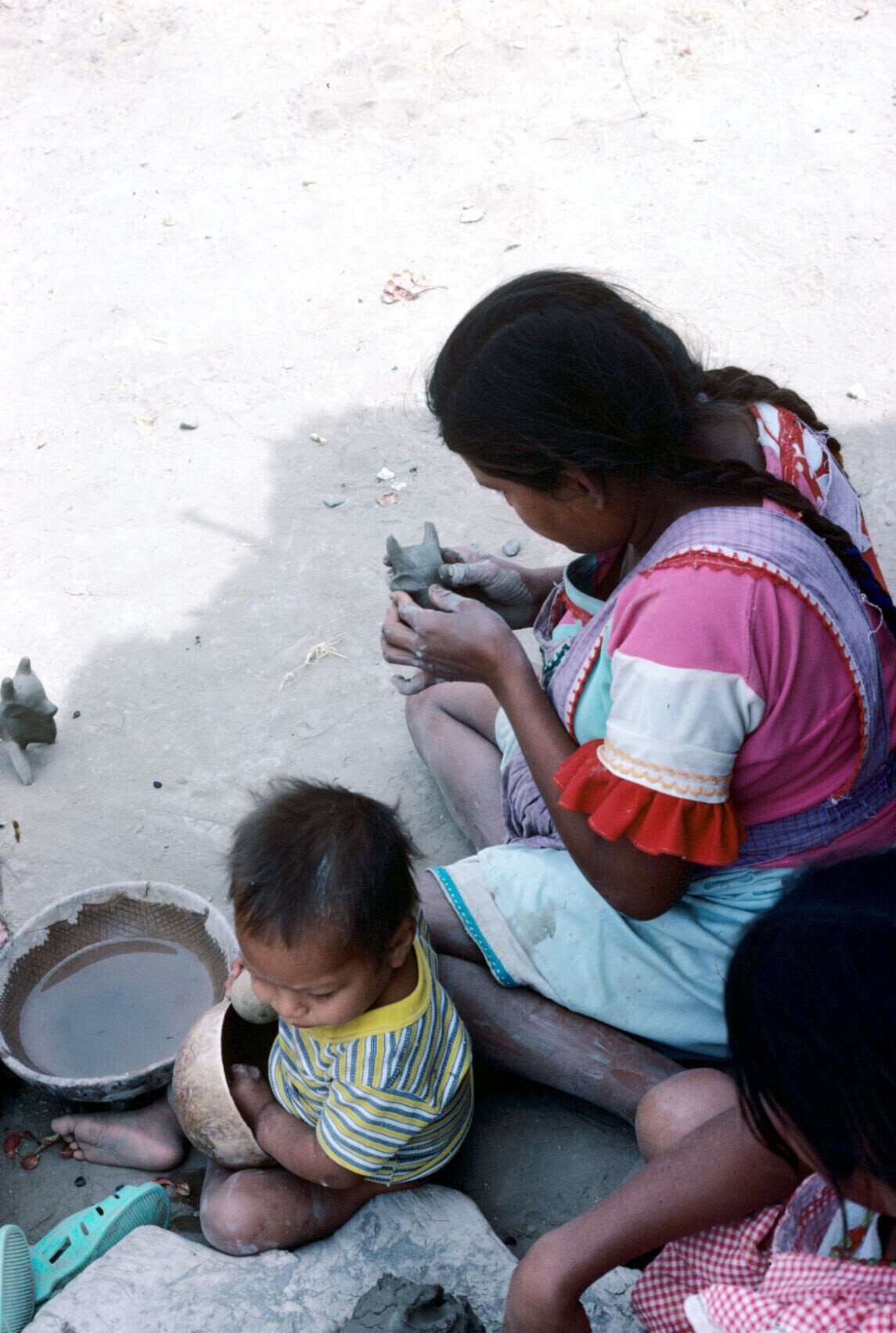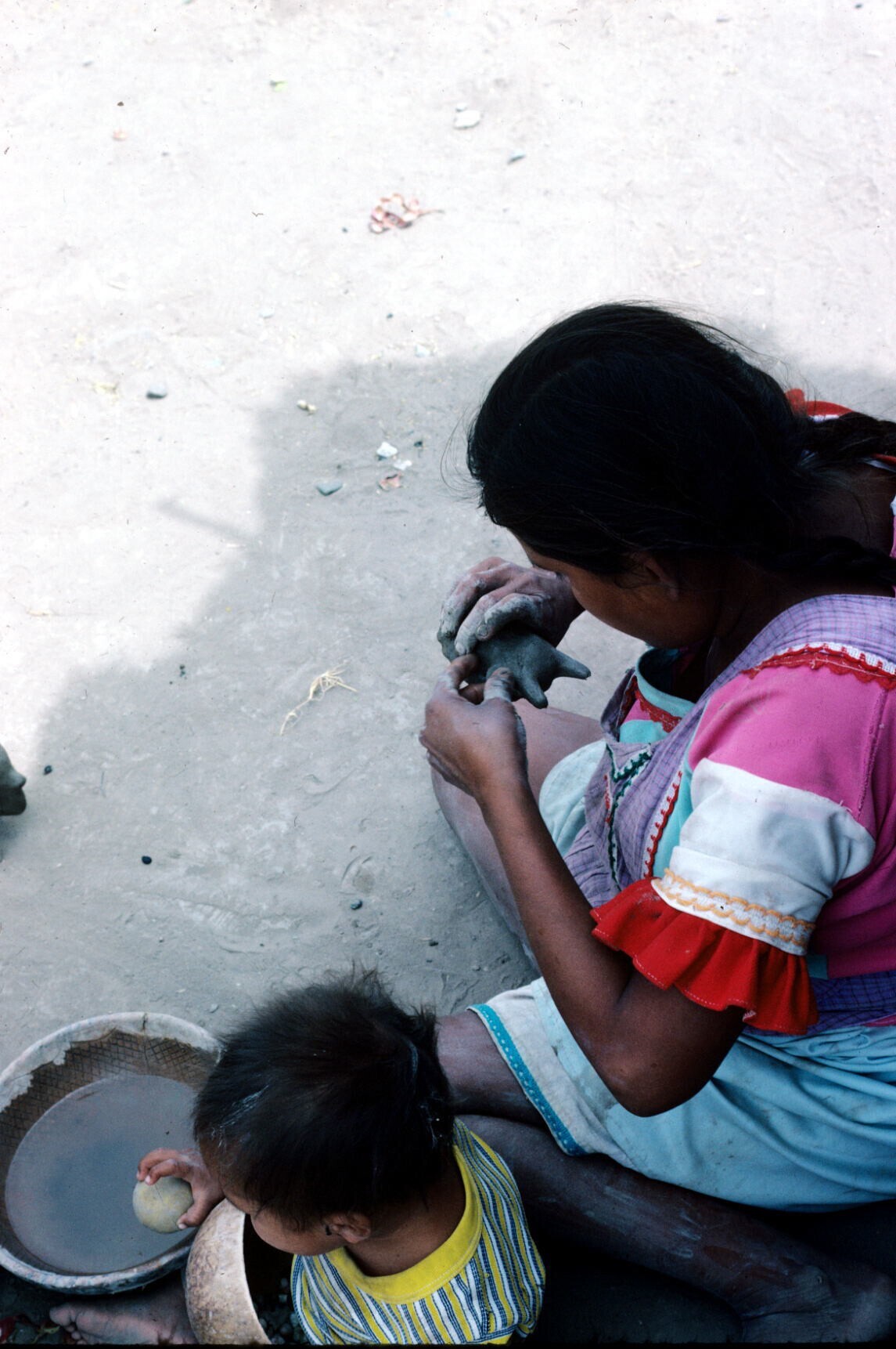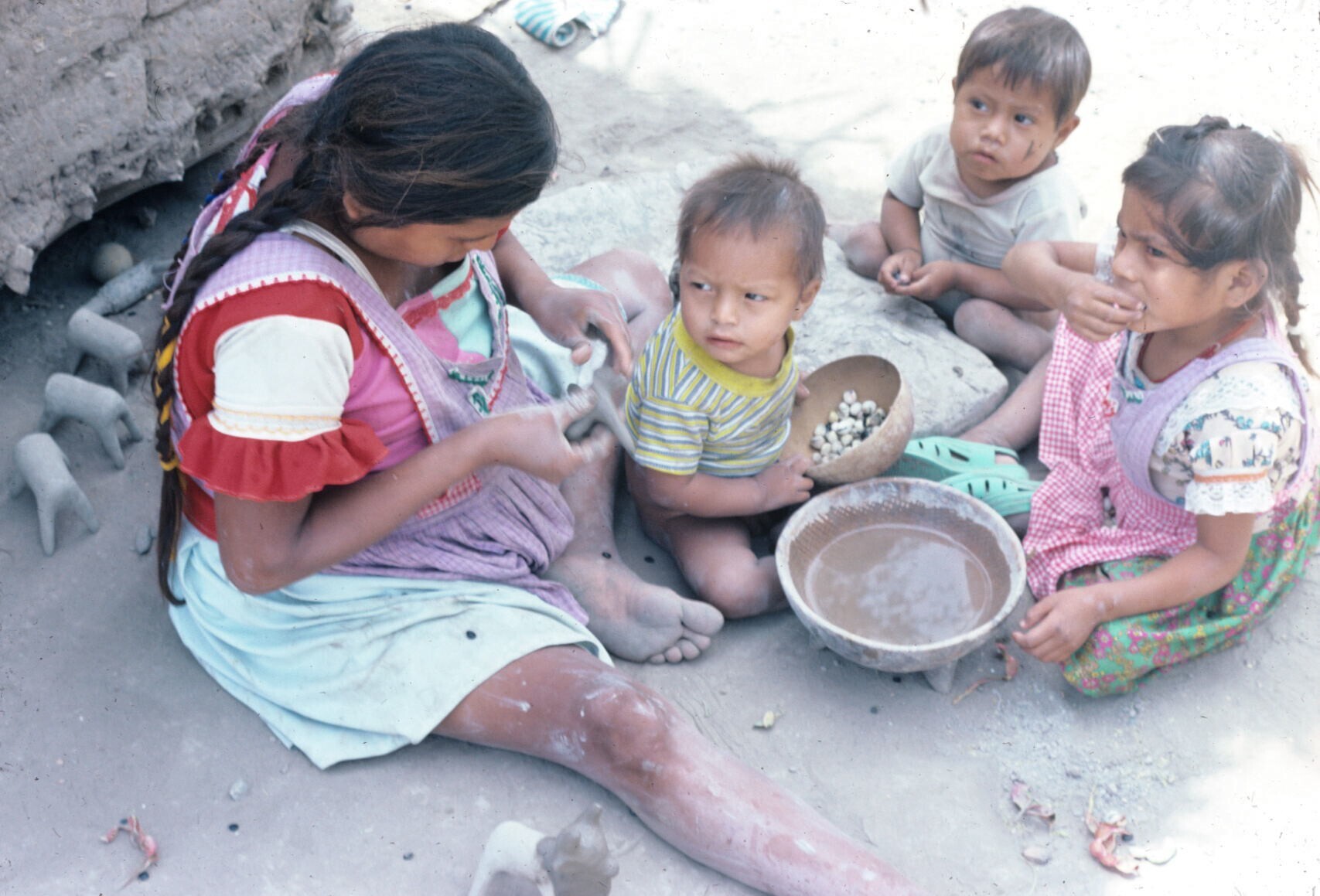 Paula Salvador met kinderen op erf, aardewerk "figur...