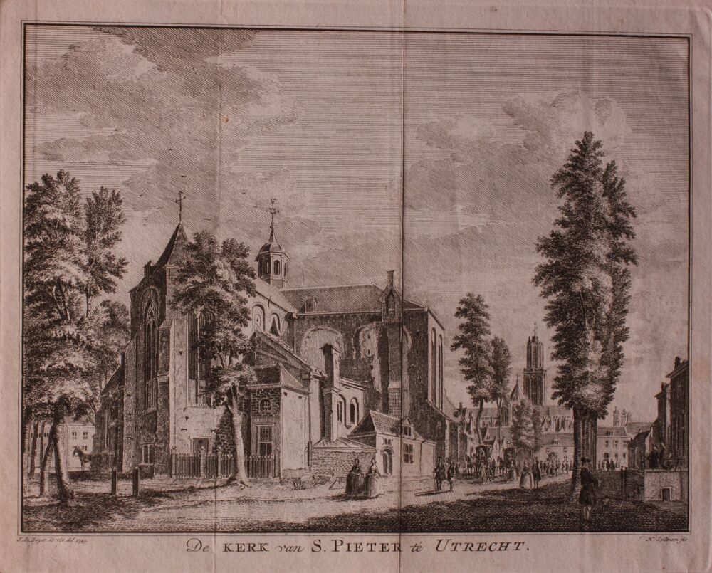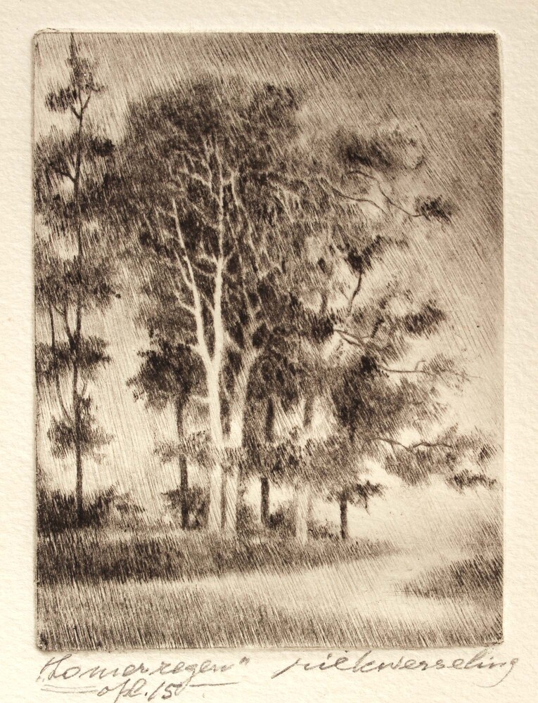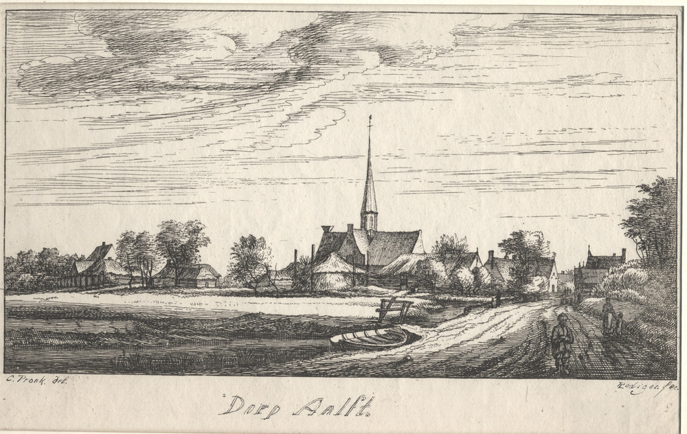 gezicht op Aalst met kerkje en boerenwoningen. Gravu...
