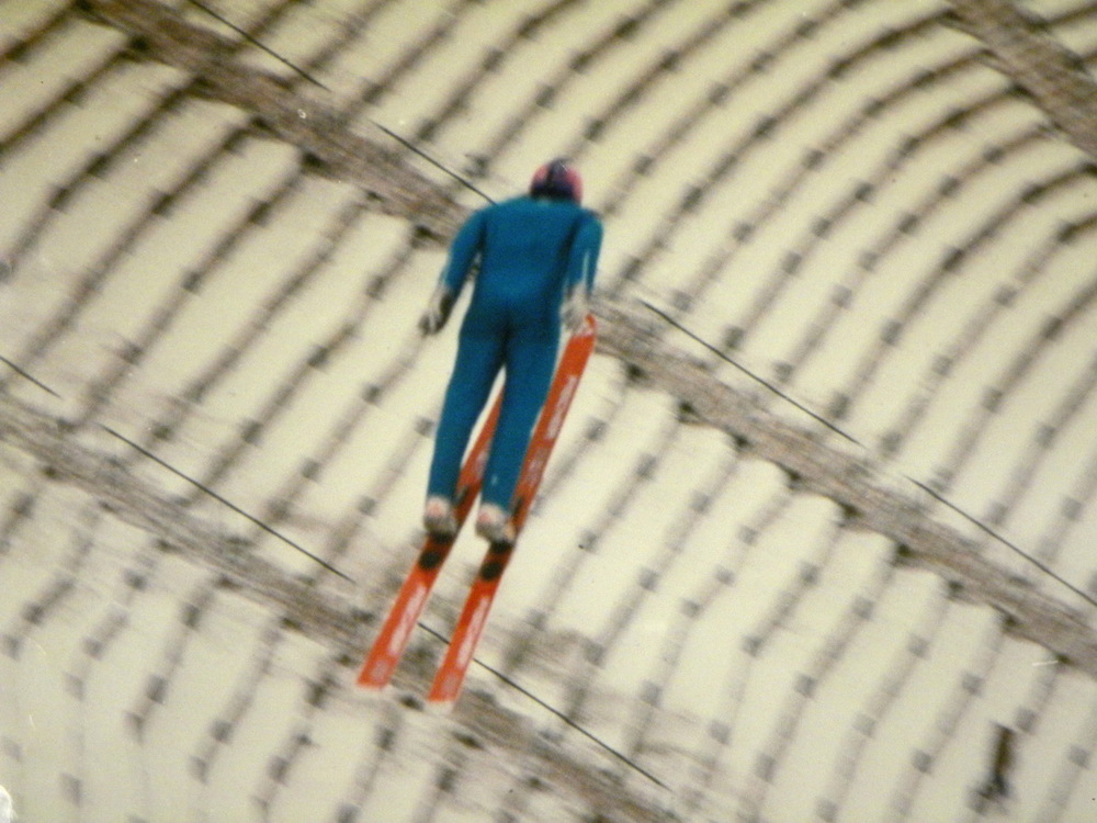 Foto skispringer G.J. Konijnenberg in vlucht tijdens...