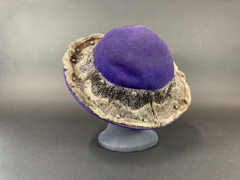Paarse vilthoed met wijde bol die vloiend overloopt ...