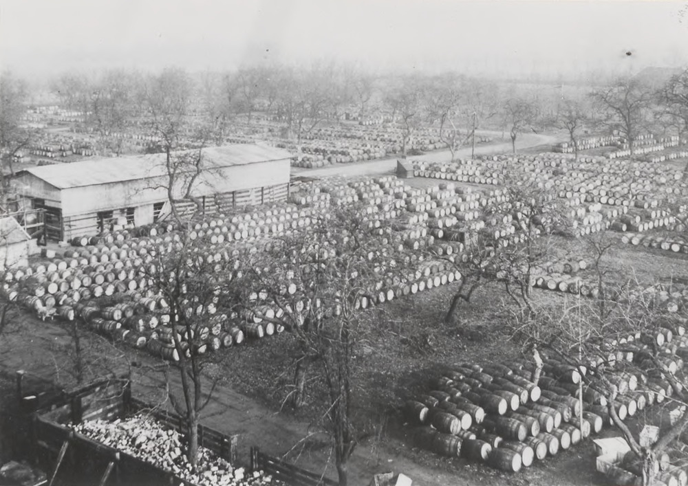 Opslagterrein voor vaten met geconserveerde vruchten...