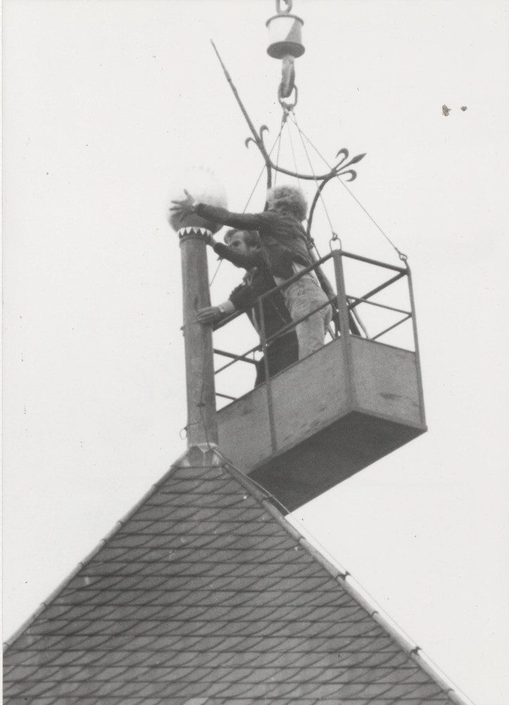 Plaatsen van de standaard op de kerktoren.