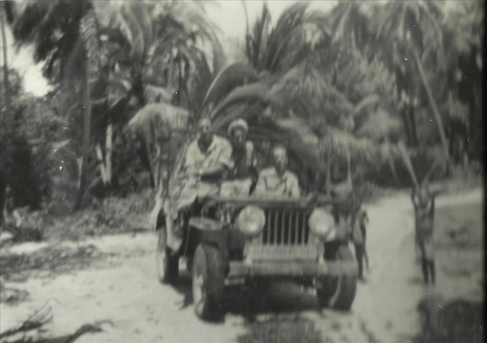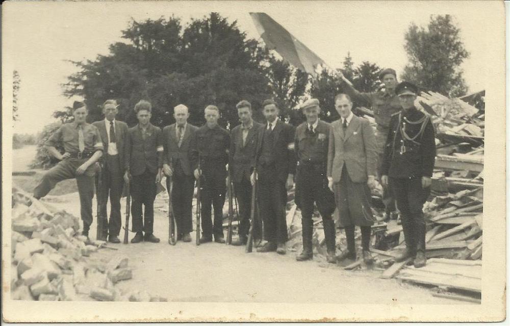Foto van 11 militairen en drie burgers op een parkee...