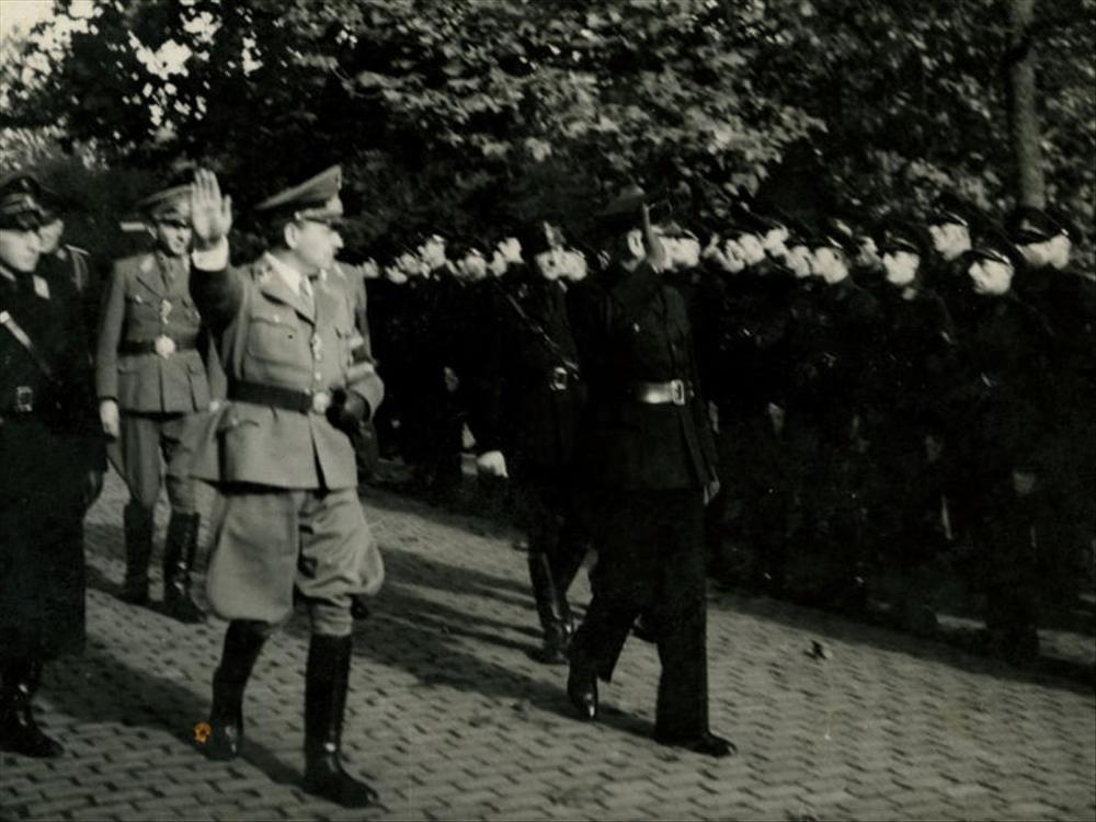 Mussert en officier NSDAP inspecteren erewacht W.A.