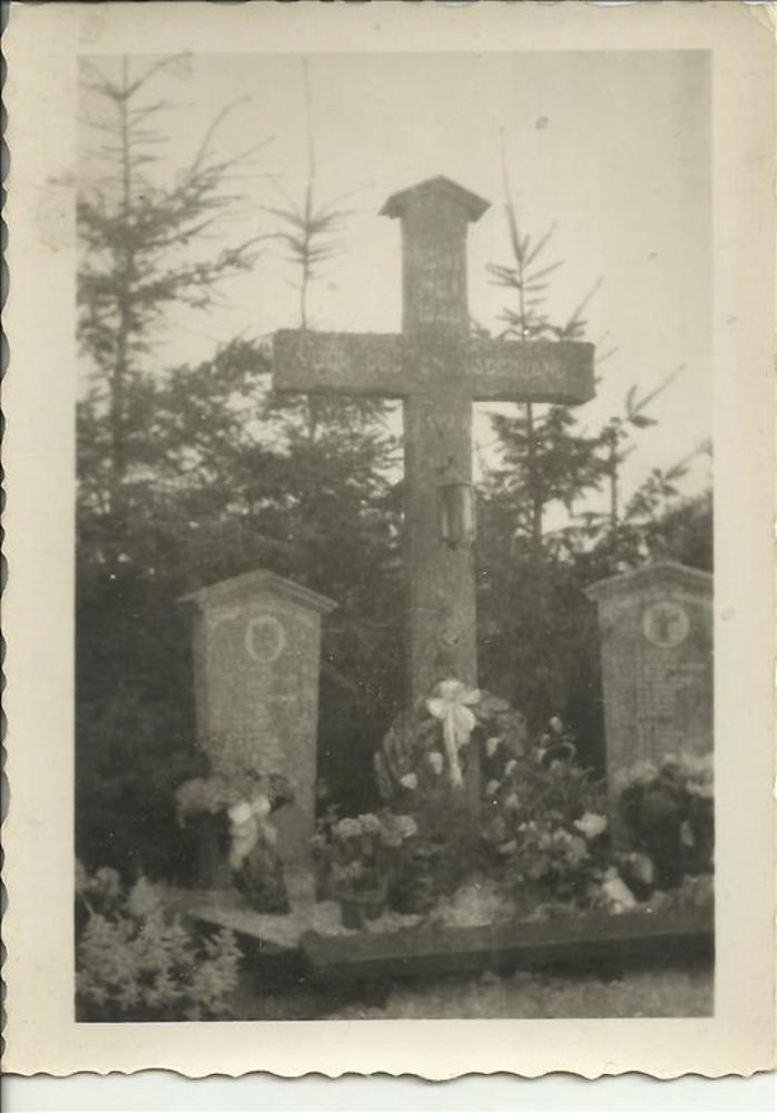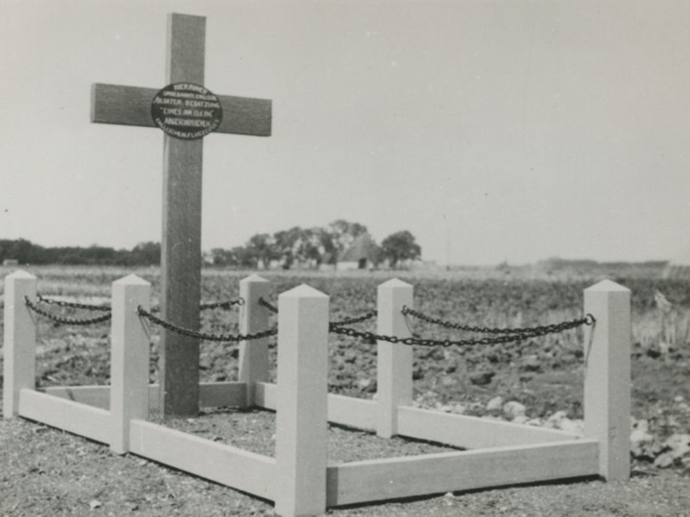 Foto van collectief graf met op kruis bord: "Hier ru...