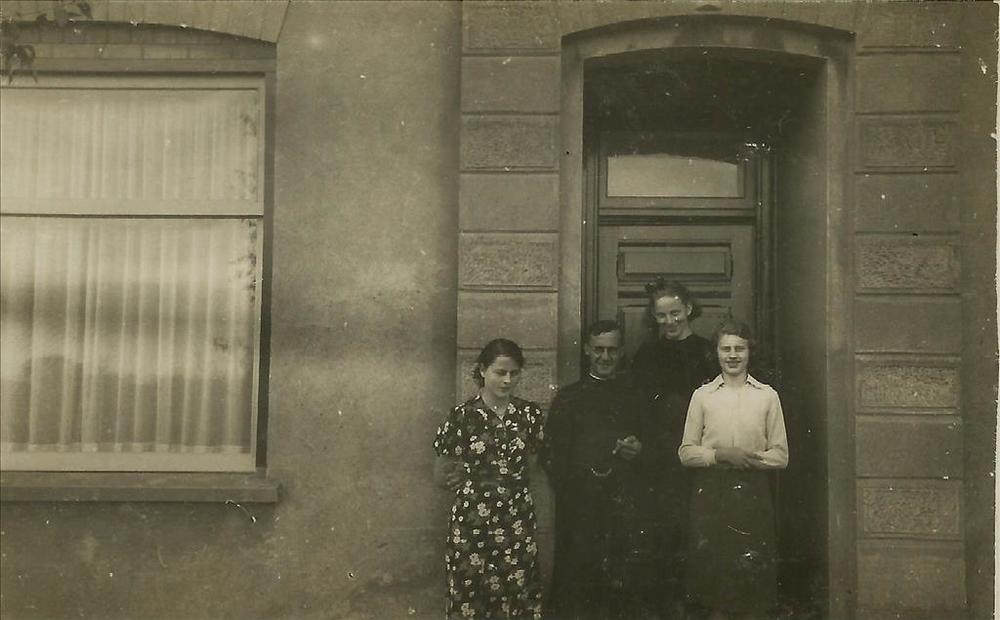 drie vrouwen, Rooms-Katholiek geestelijk, deuropening