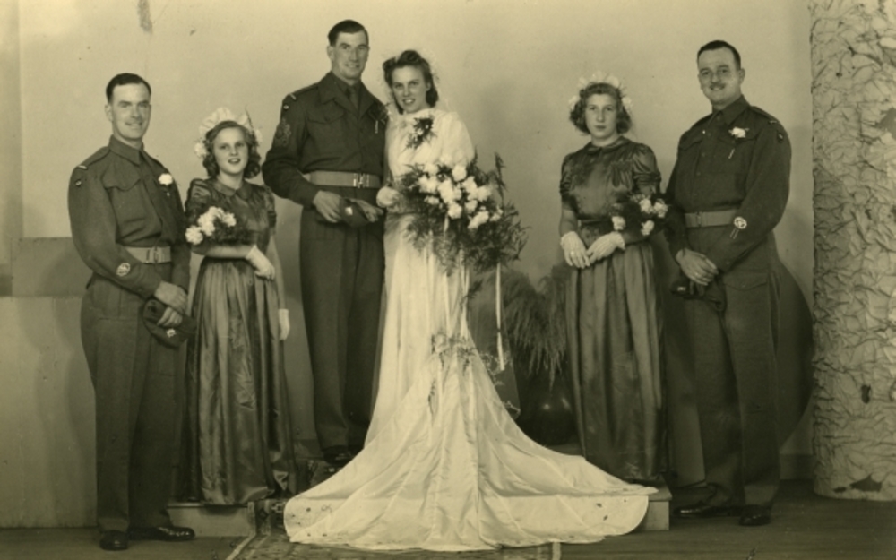 Trouwfoto: drie mannen in battledress, een bruid in ...