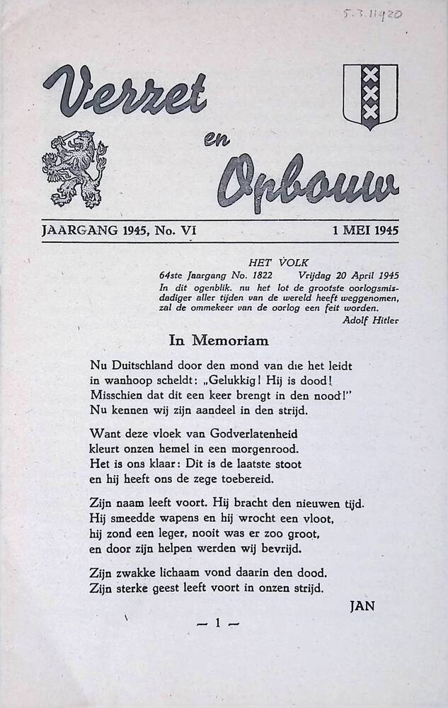 Verzet en Opbouw, Jaargang 1945, No. VI, 1 Mei 1945